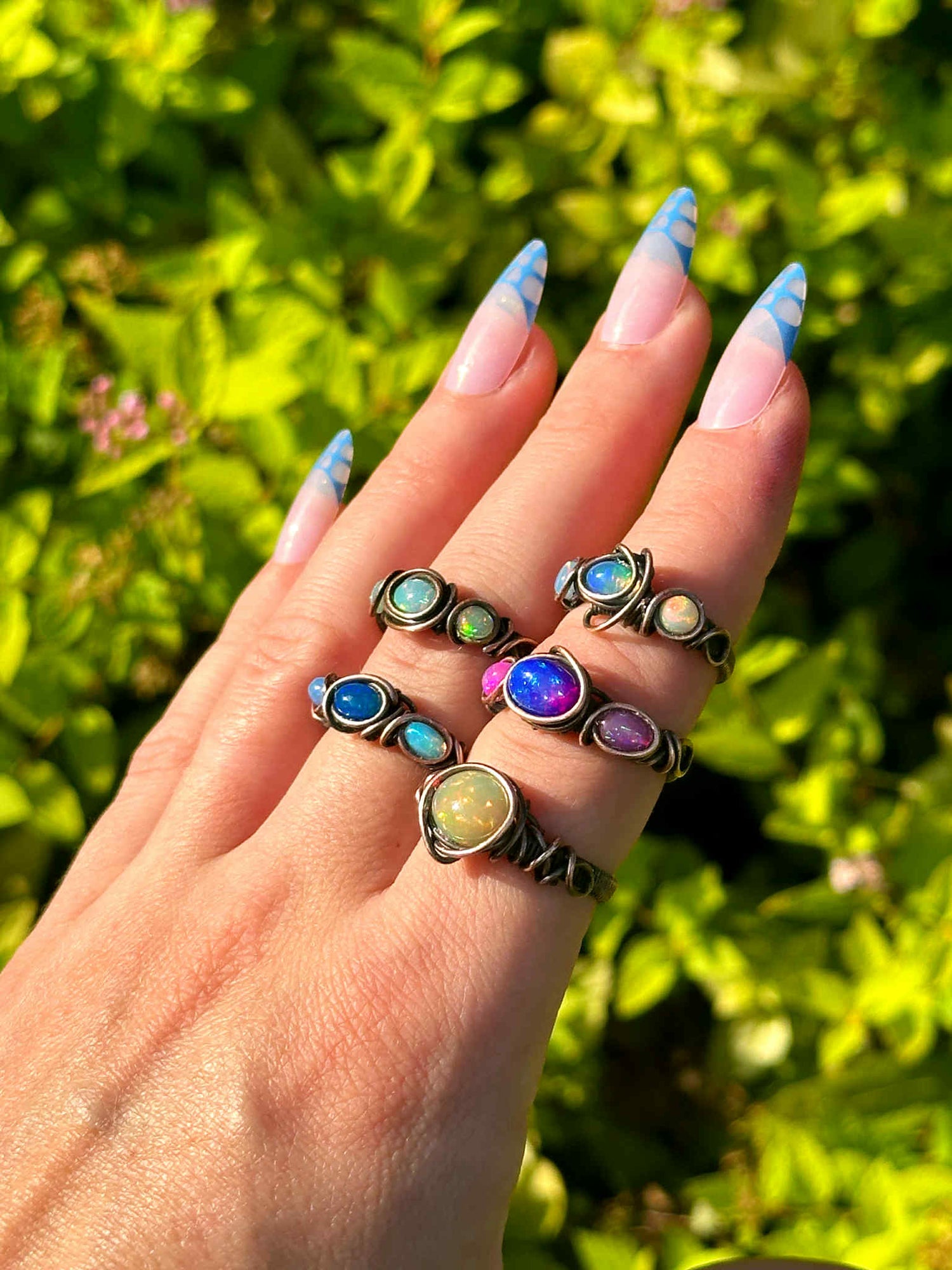 Radiant opals set in warm, hand-formed copper capture the balance of fiery earth tones and ethereal shimmer. Celebrated for sparking creativity and amplifying intuition, each ring is both a statement of style and a personal talisman. Inspired by the shifting glow of the aurora, these pieces bring cosmic beauty, vibrant energy, and a touch of magic to every look.