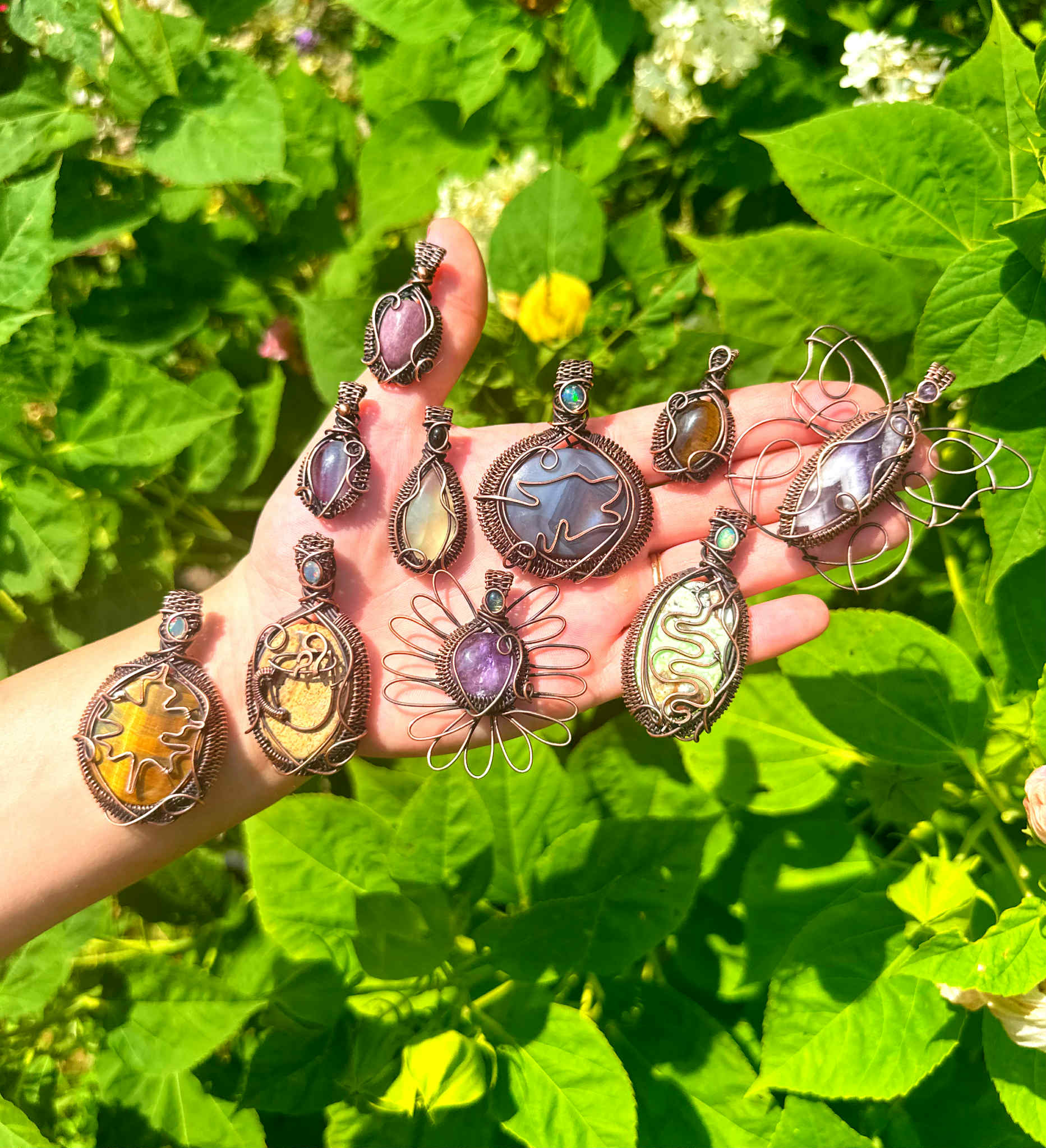 At Empress Emerald, I am a one-gal crafter who creates unique wire-wrapped pendants with genuine copper wire and ethically sourced stones from Jaipur, India. Each piece is curated with a natural aesthetic in mind, allowing for self-expression and individuality.