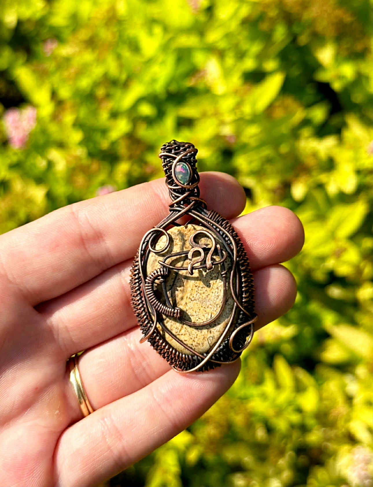 Wolf Grey Agate & Opal Crystal Copper Pendant