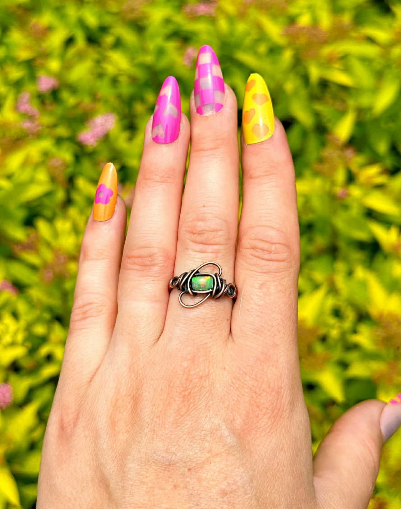 Radiant opals set in warm, hand-formed copper capture the balance of fiery earth tones and ethereal shimmer. Celebrated for sparking creativity and amplifying intuition, each ring is both a statement of style and a personal talisman. Inspired by the shifting glow of the aurora, these pieces bring cosmic beauty, vibrant energy, and a touch of magic to every look.