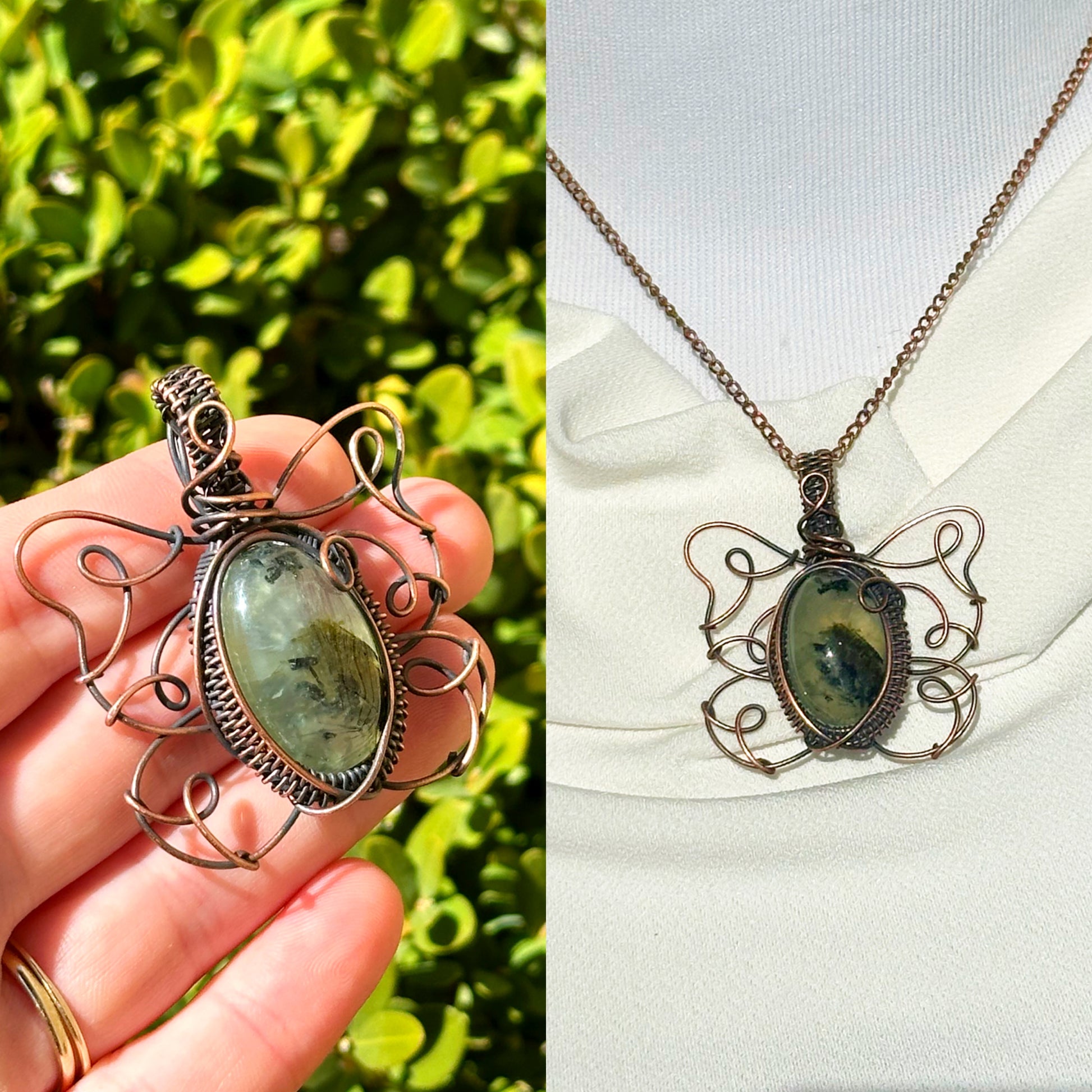 • Encased in 100% natural copper wire, this design enhances the stone’s healing energy. Copper complements prehnite’s properties, promoting emotional balance and physical vitality.
