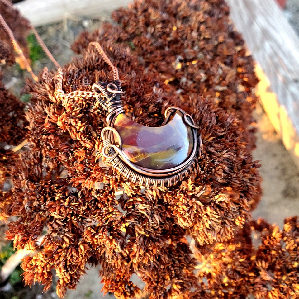 Crescent Moon Mookite Jasper Crystal Copper Pnedant