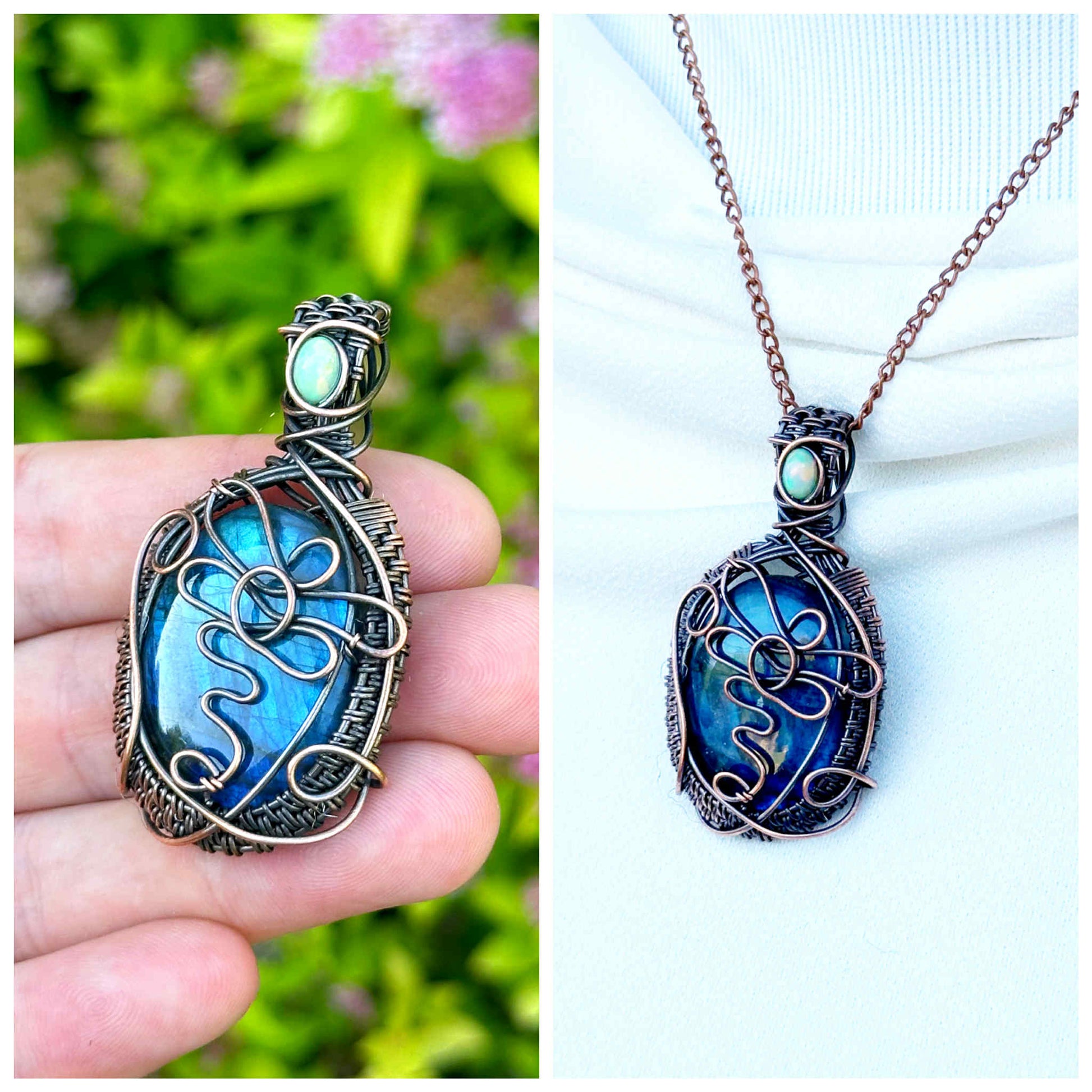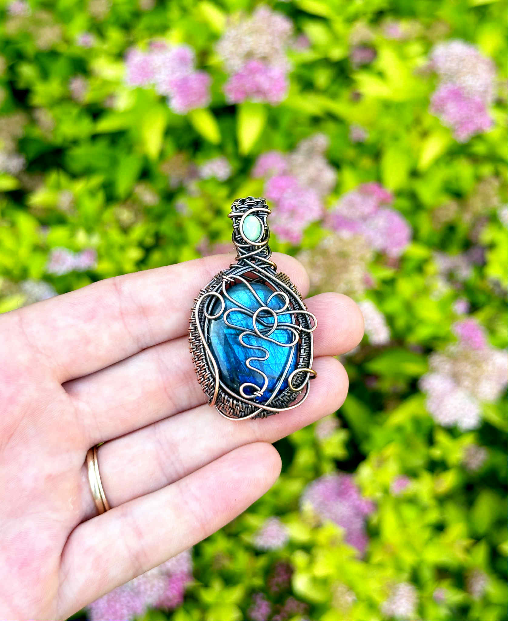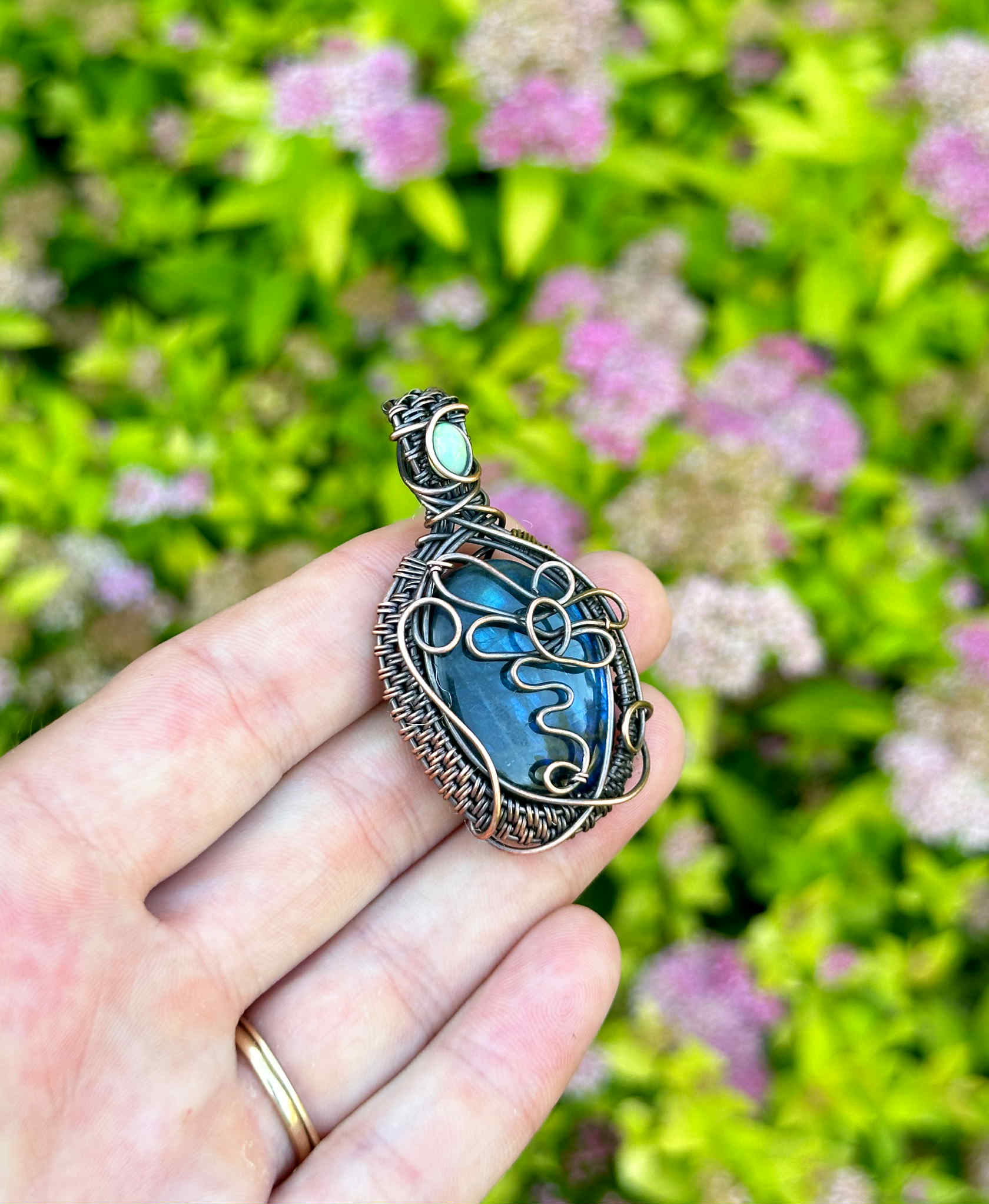 Wrapped in pure copper wire to enhance the natural iridescence of the stone with warm, grounding energy.