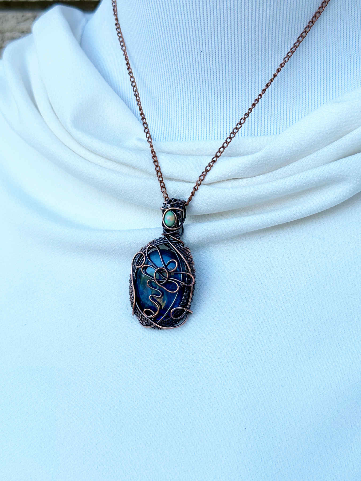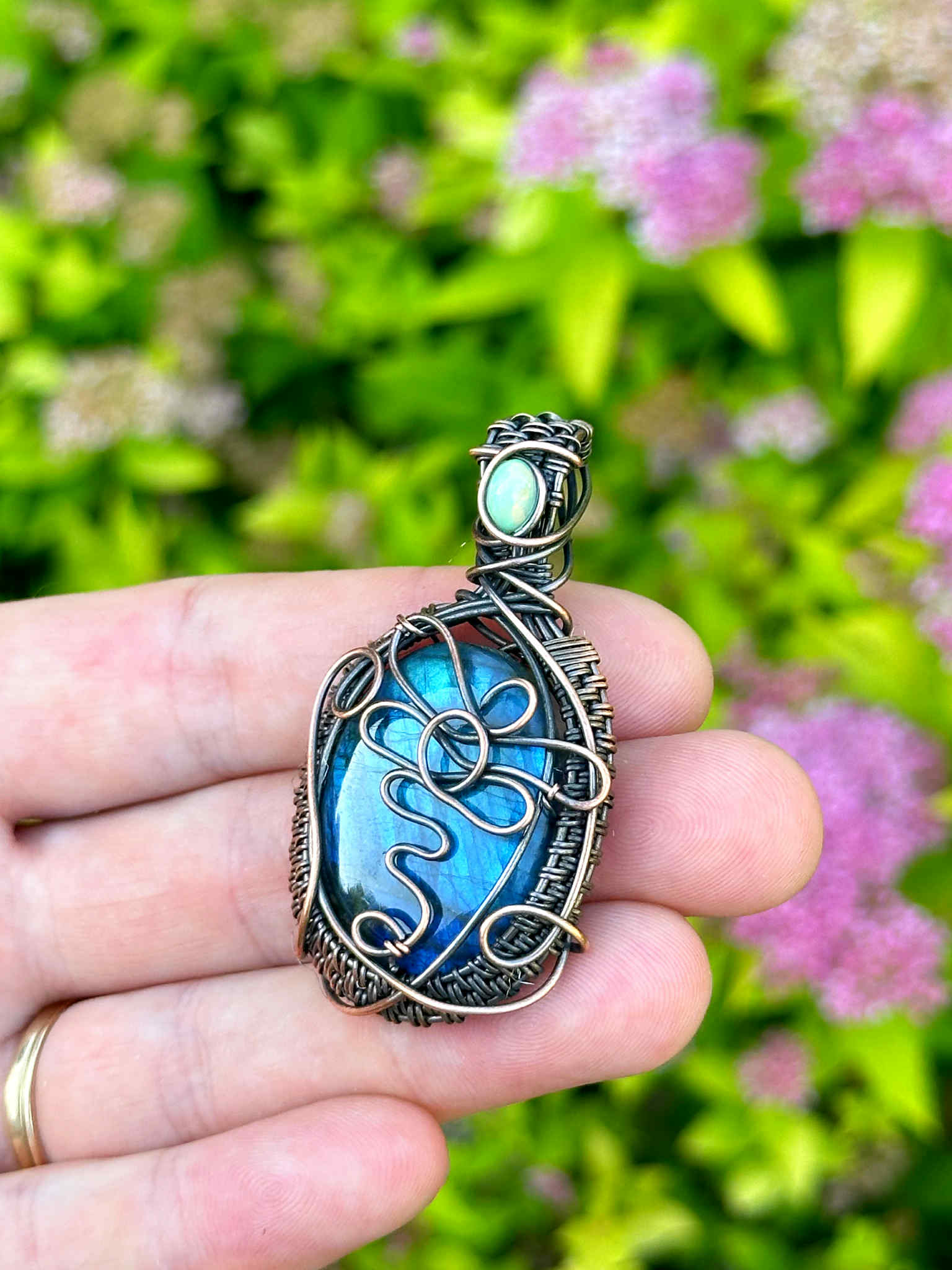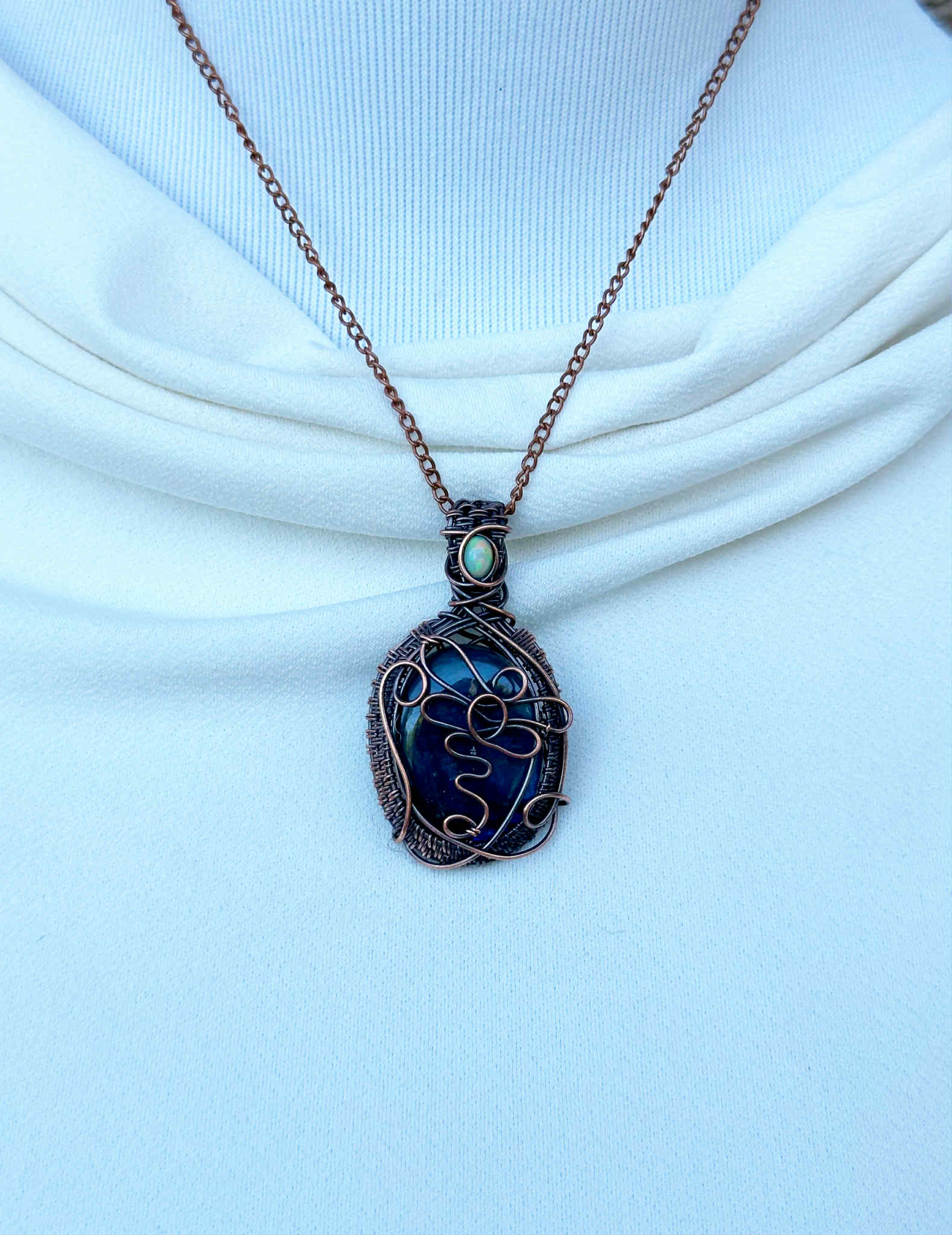 Wrapped in pure copper wire to enhance the natural iridescence of the stone with warm, grounding energy.