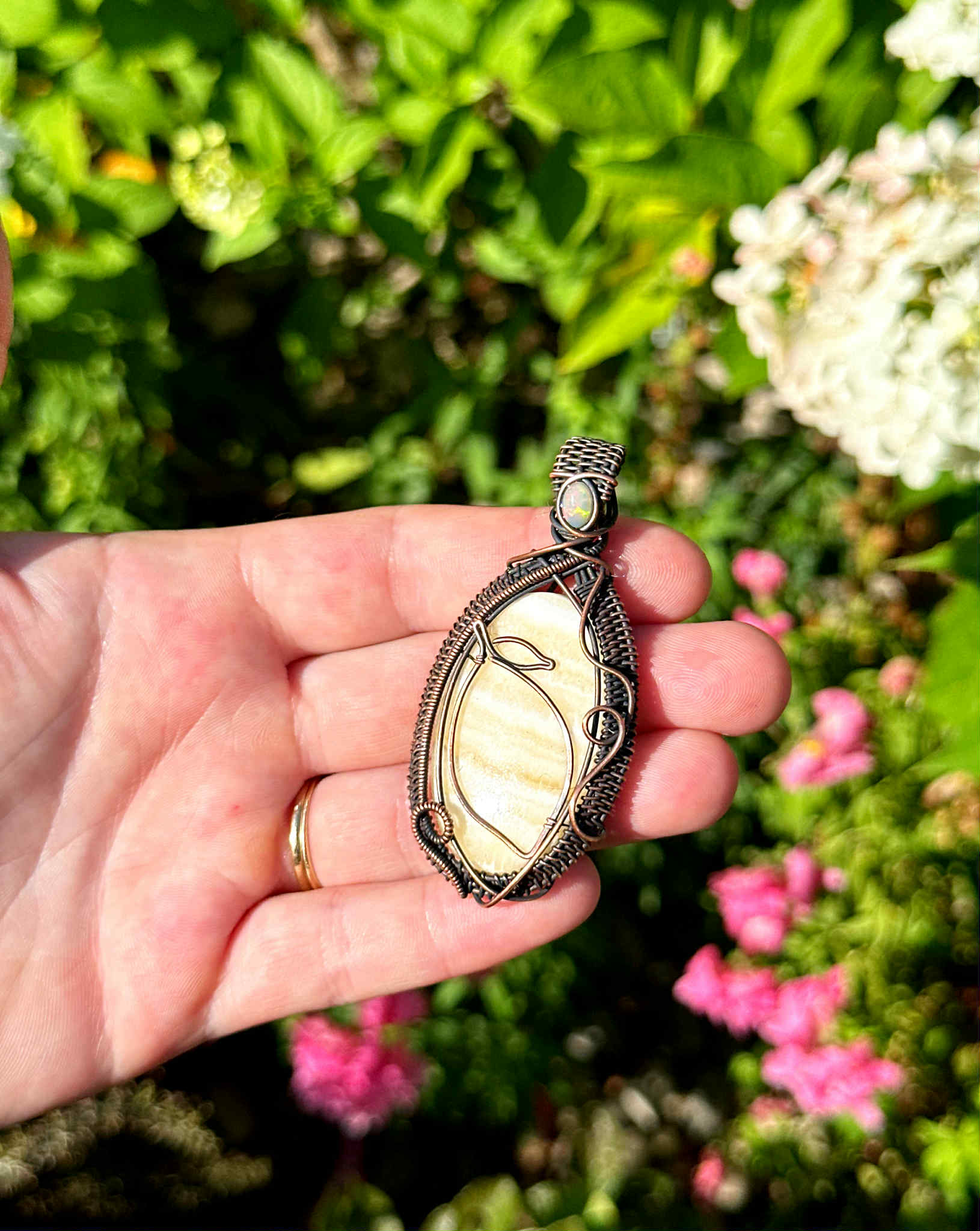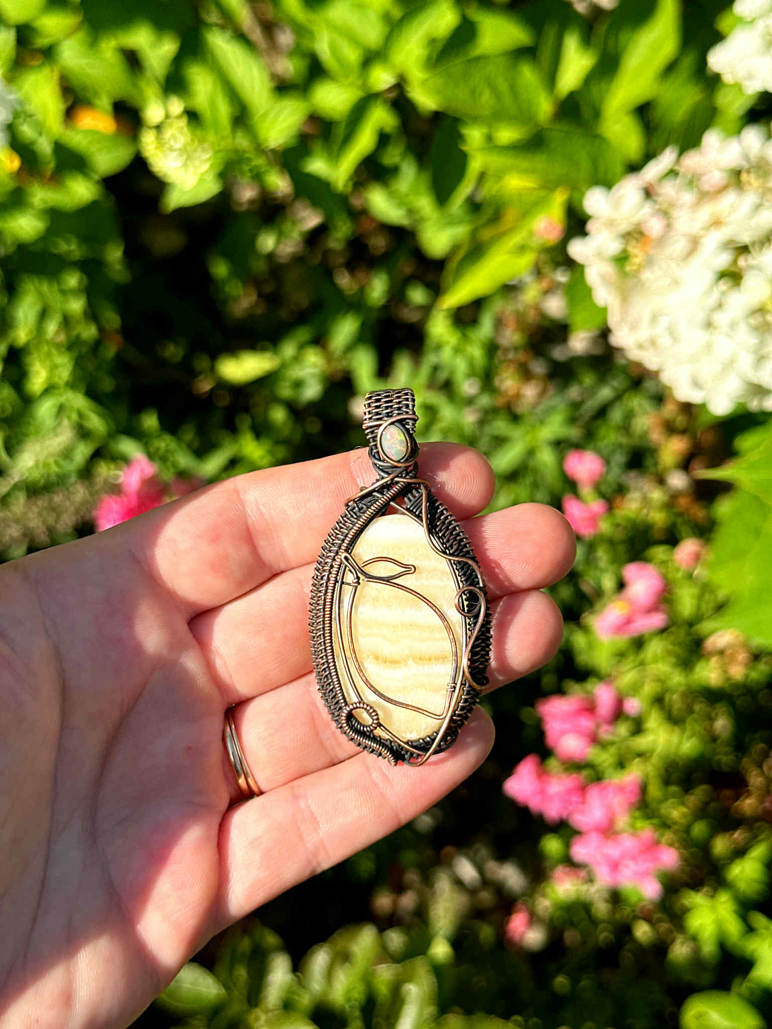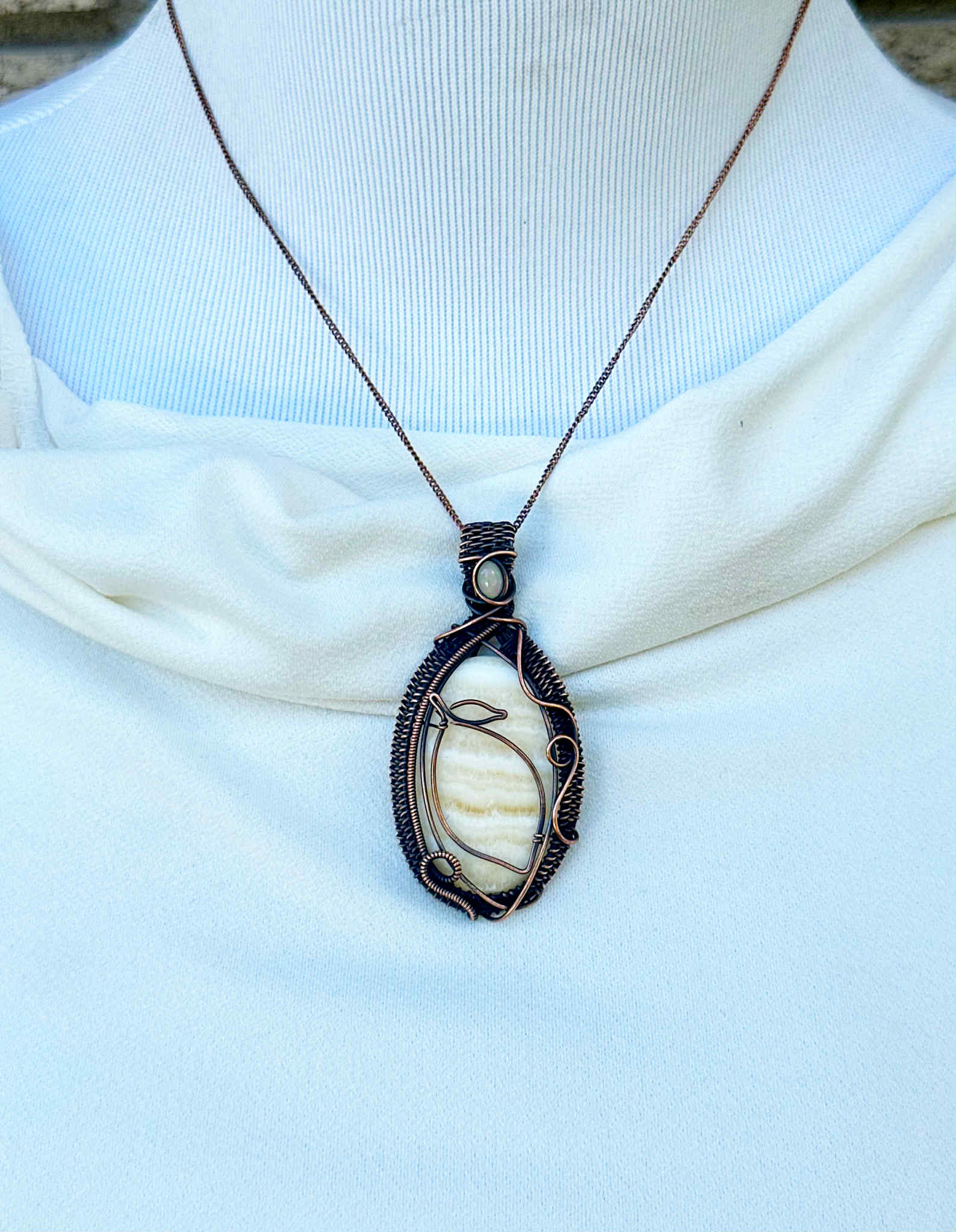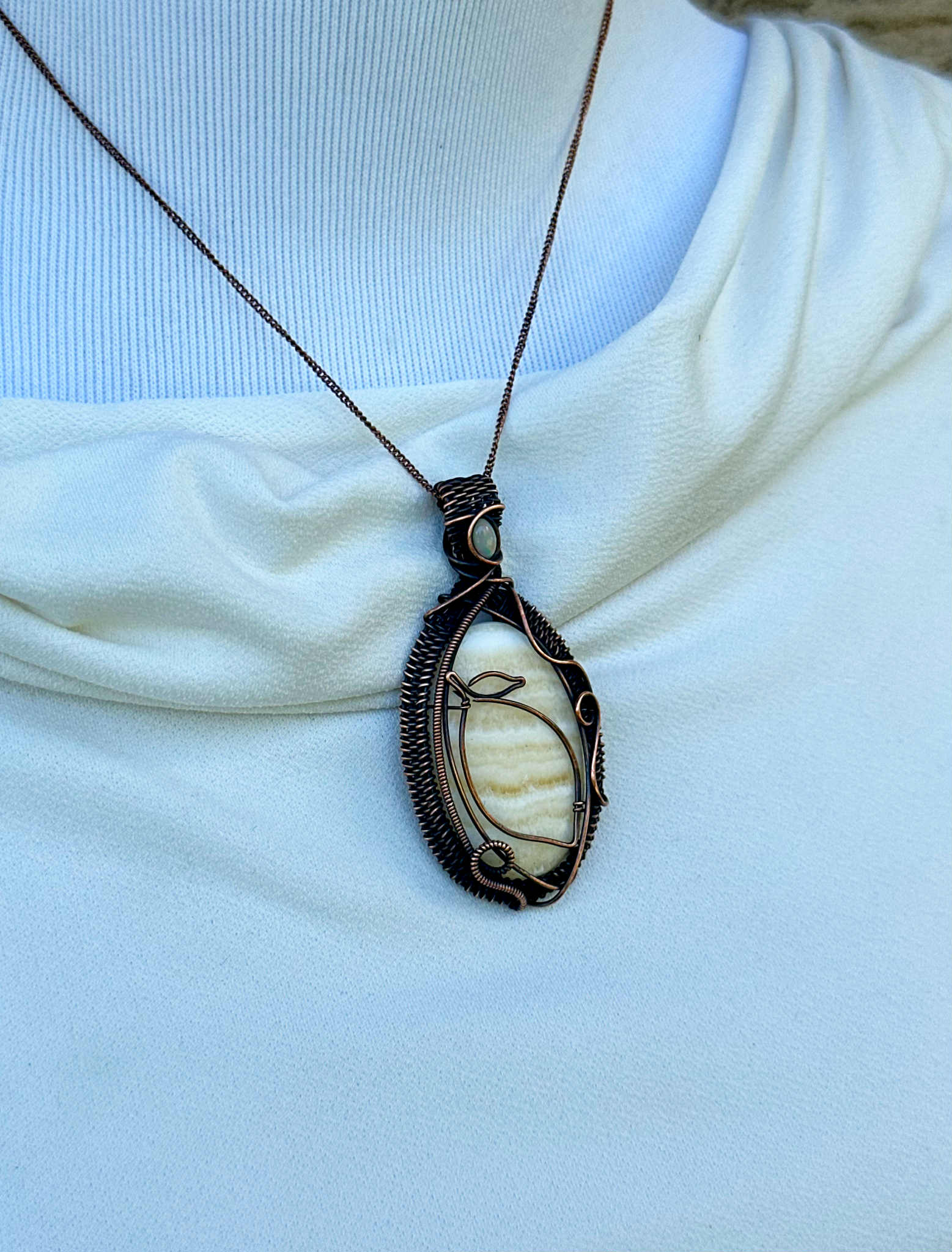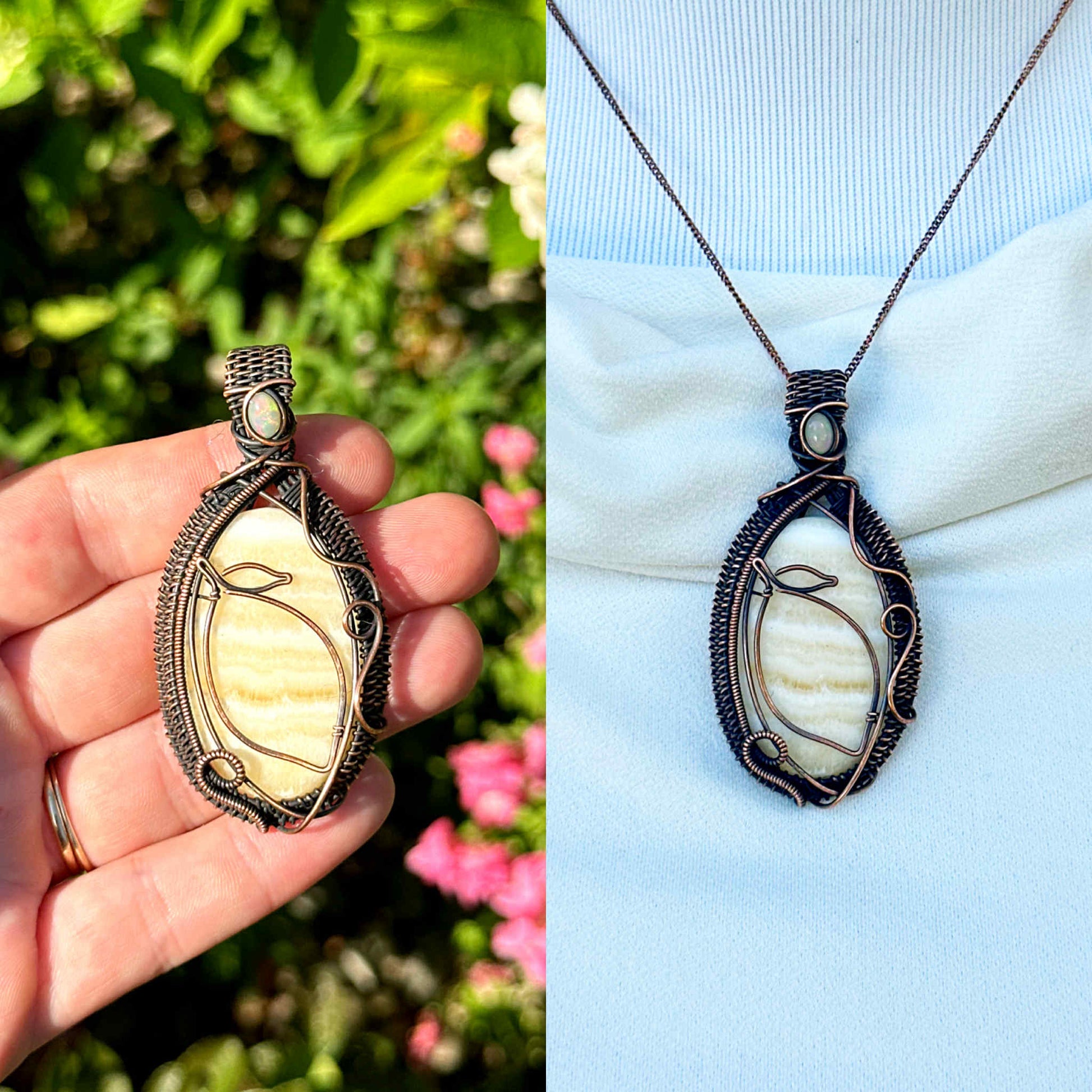 Wrapped in pure copper wire to enhance the stone’s gentle radiance with grounding, stabilizing energy.