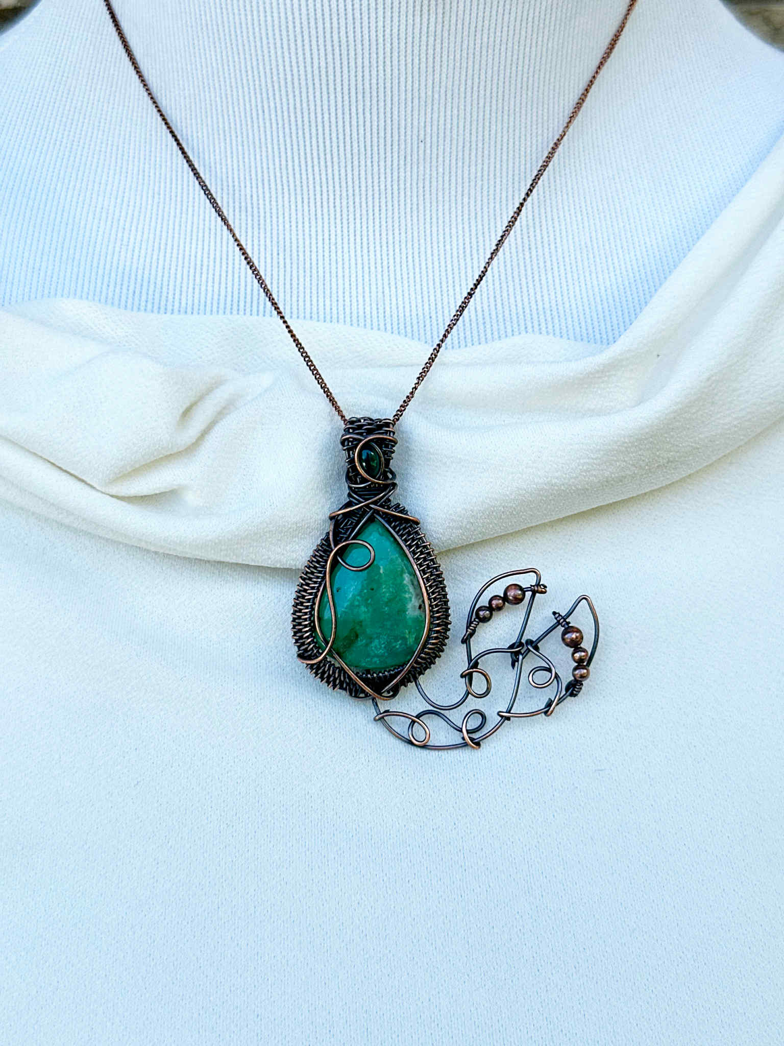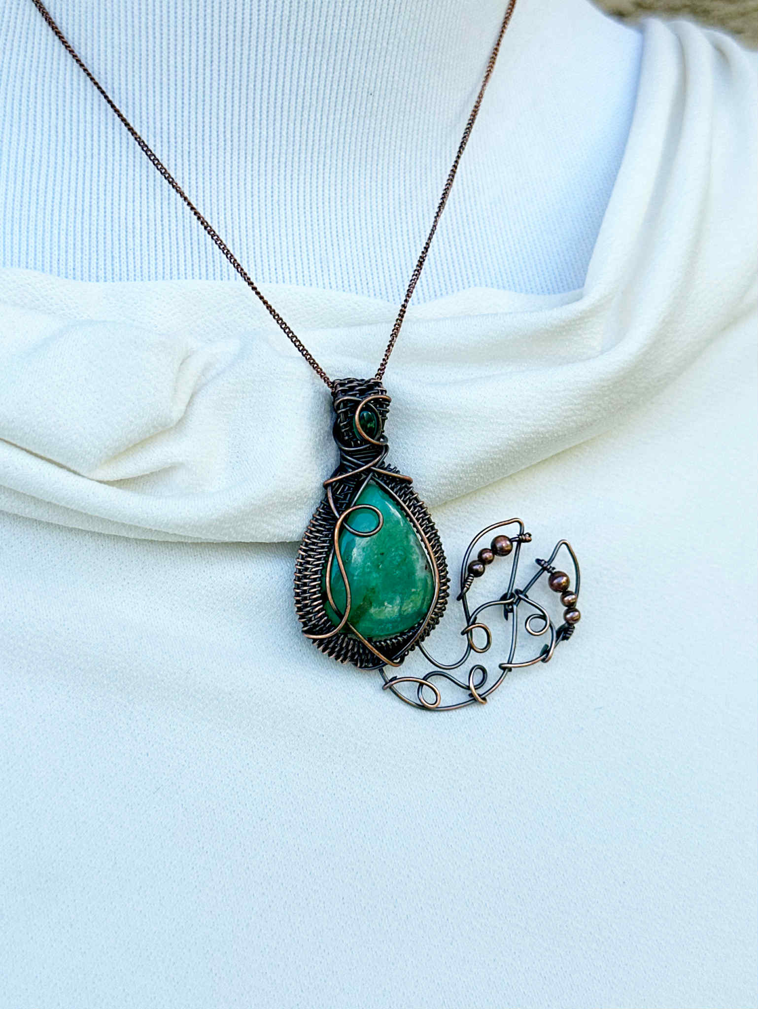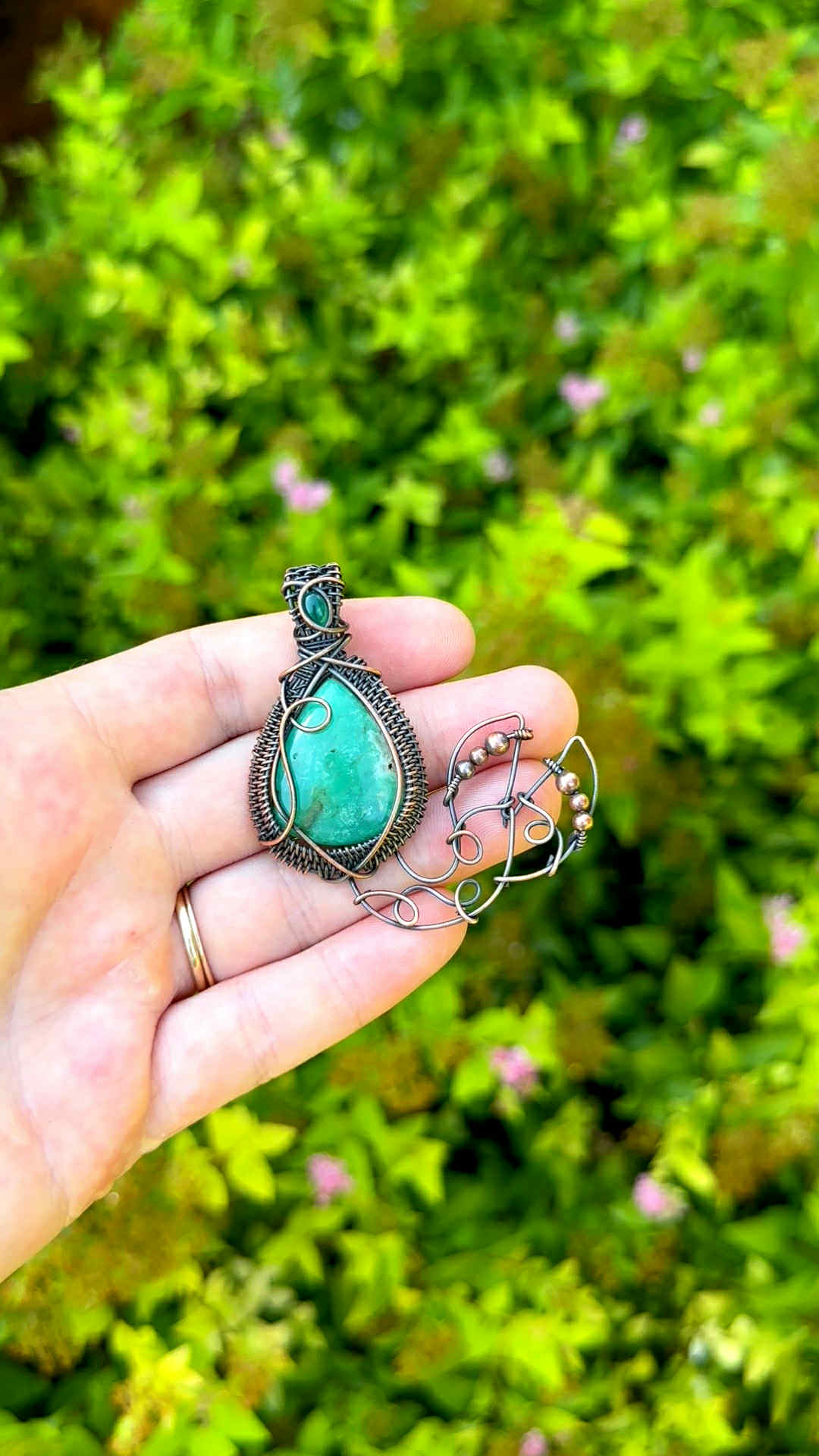 Wrapped in pure copper wire to blend the grounding warmth of metal with the cool healing energy of the stones.