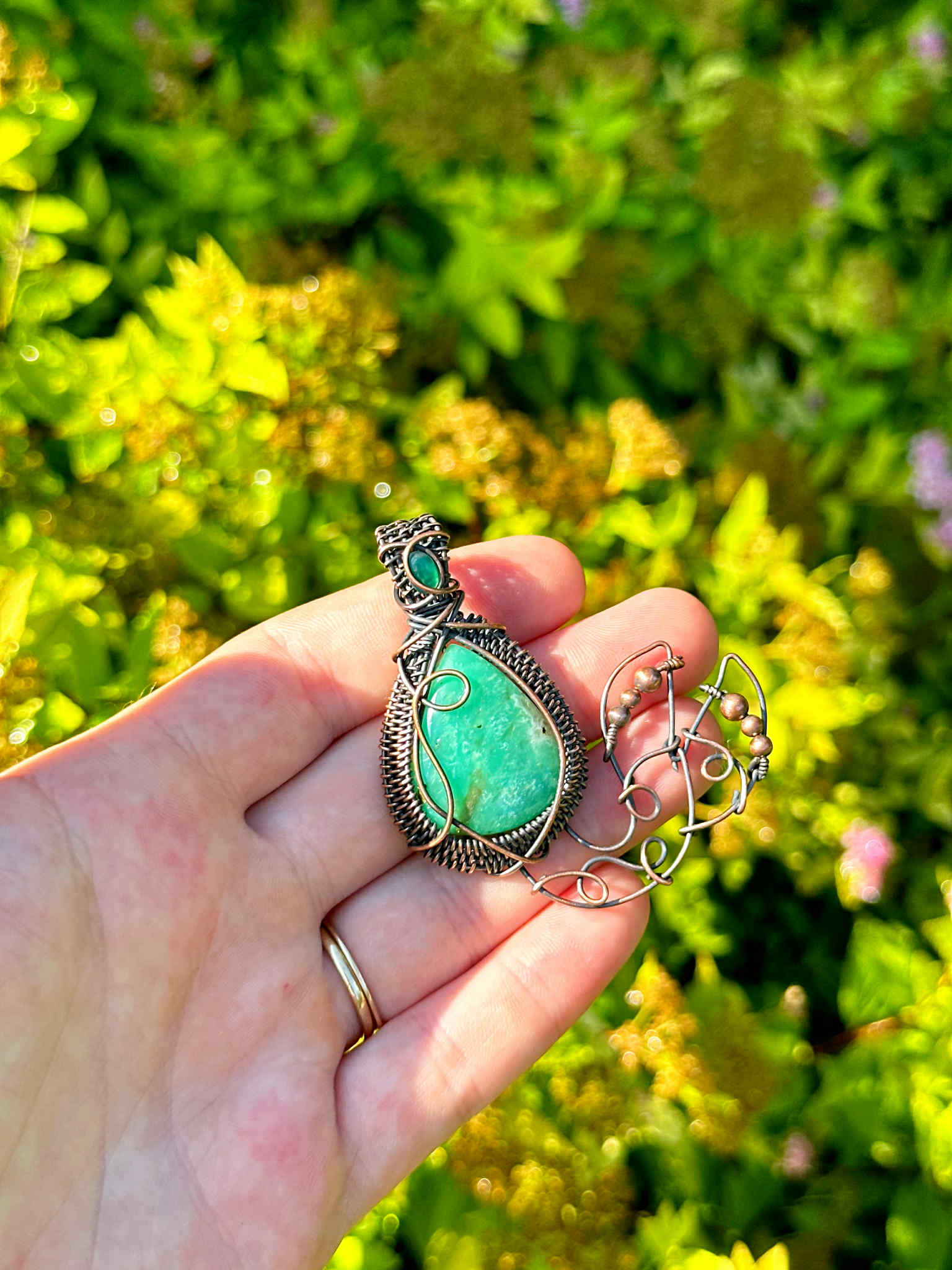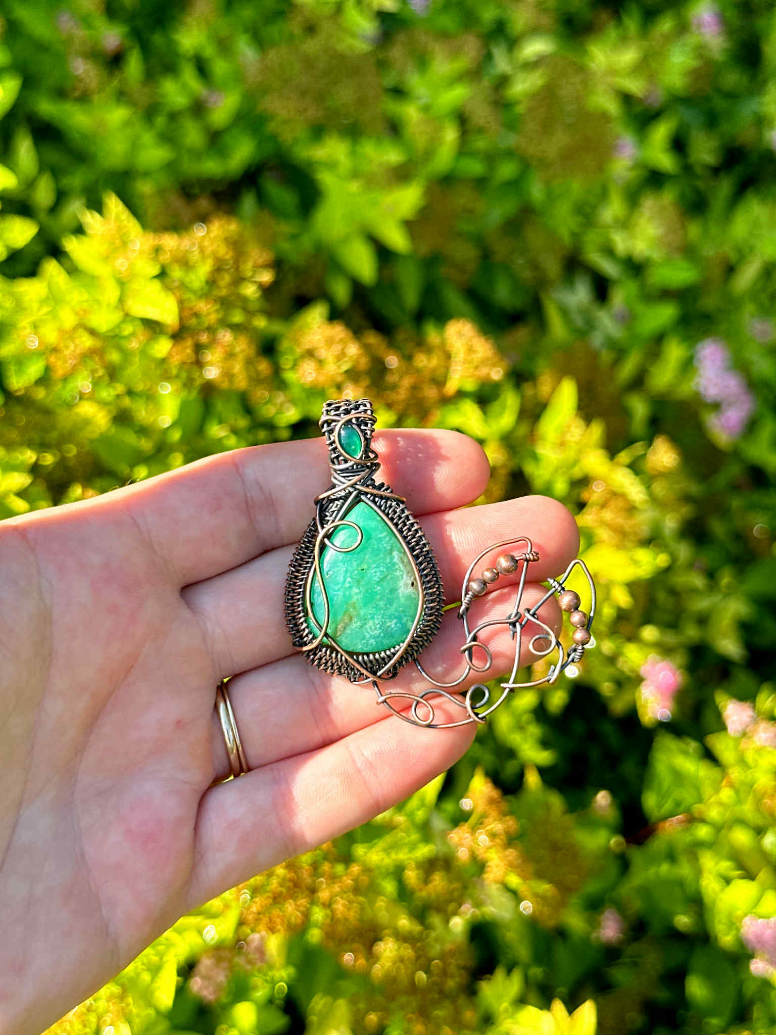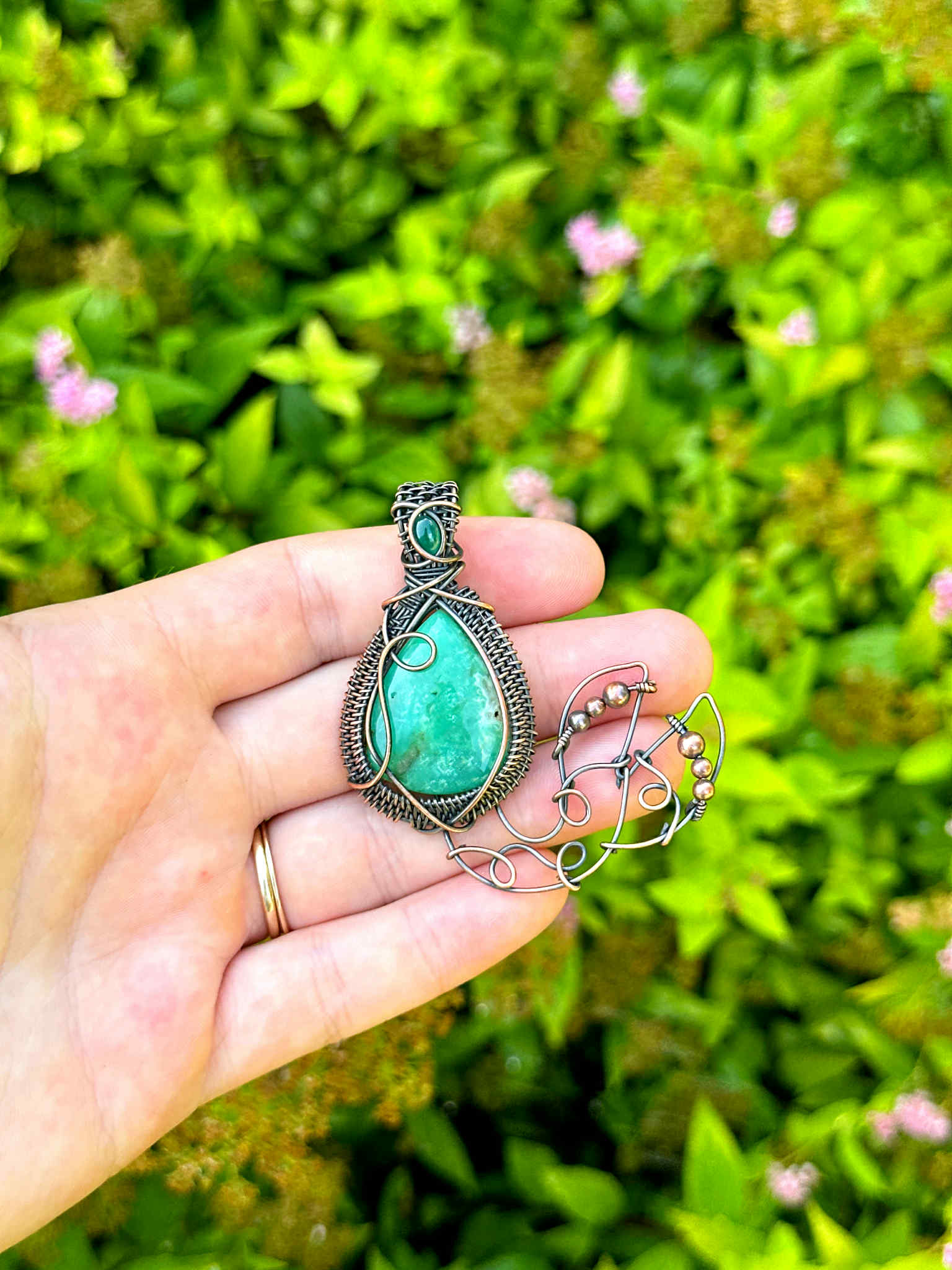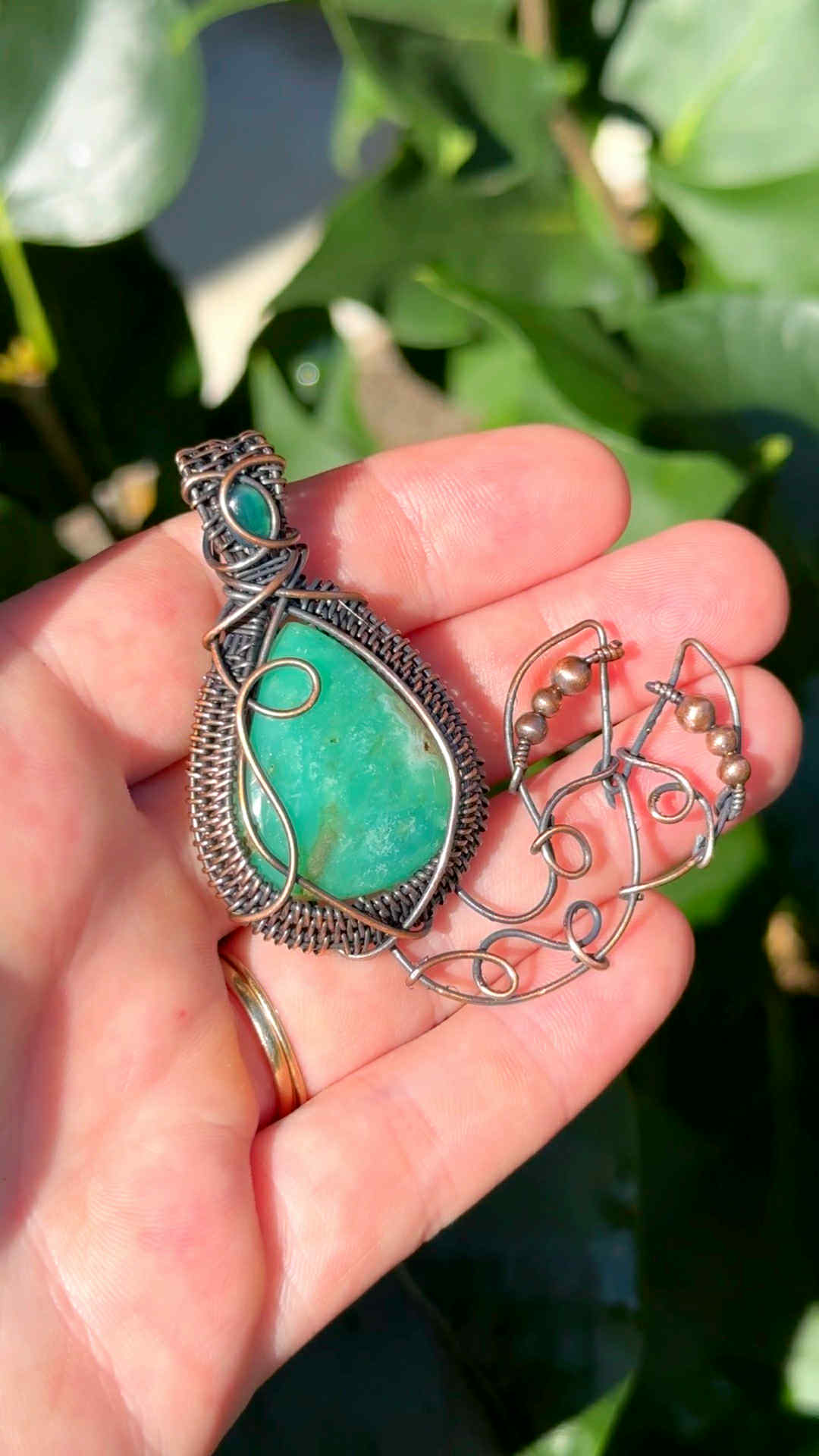 Wrapped in pure copper wire to blend the grounding warmth of metal with the cool healing energy of the stones.