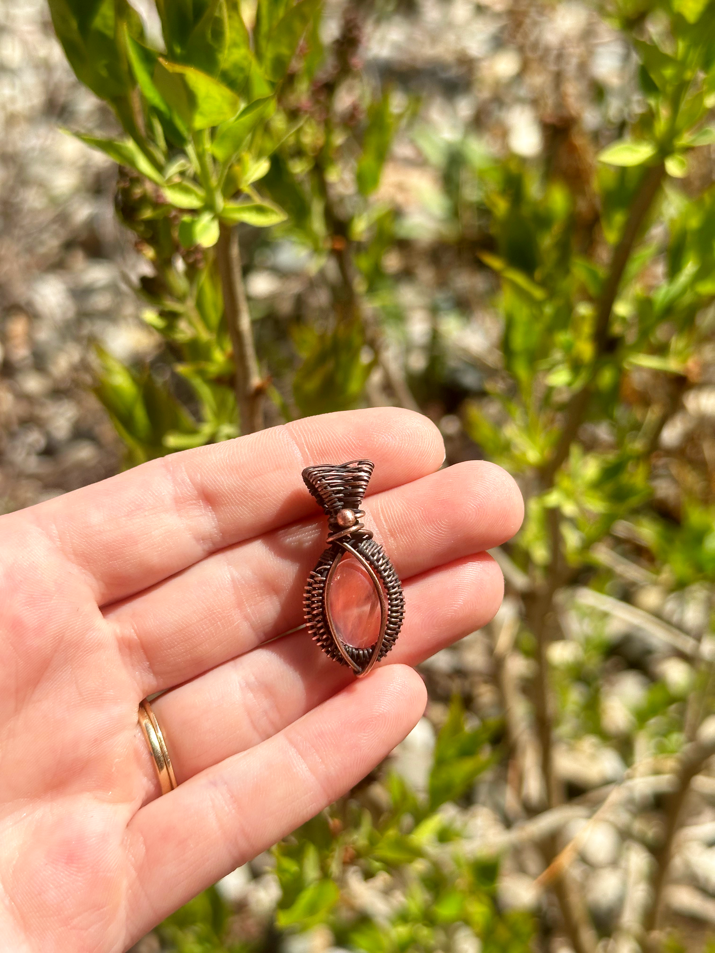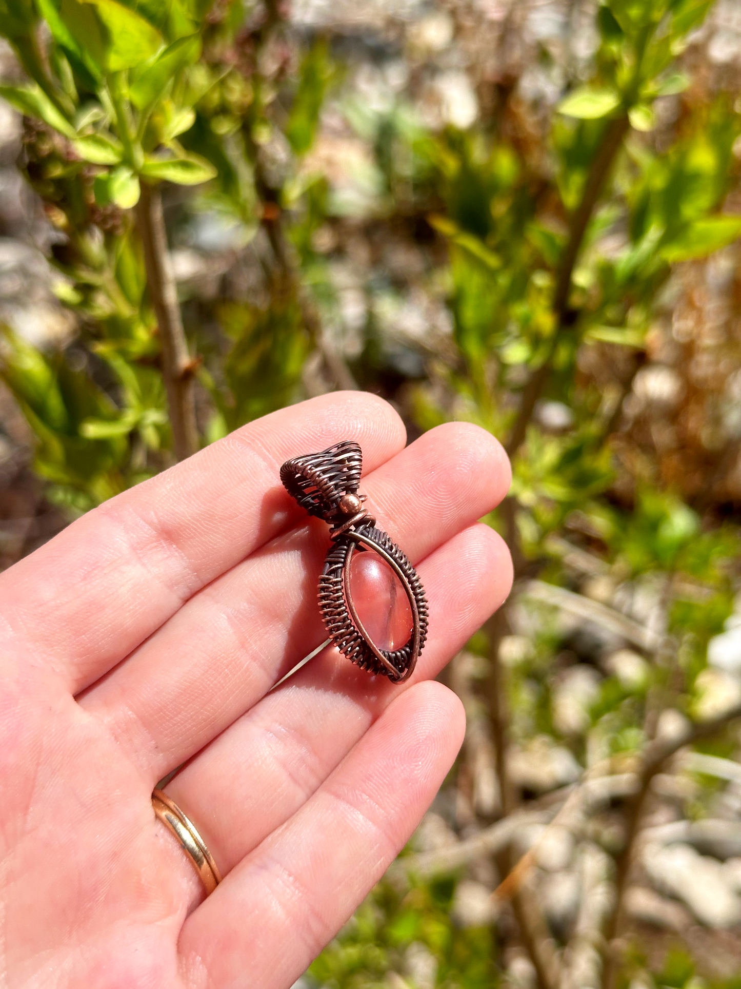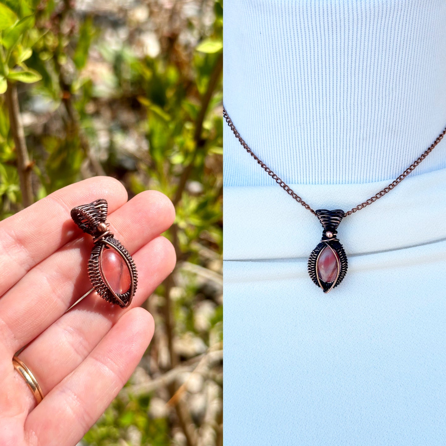 - Encased in 100% natural copper wire, this design enhances the stone’s harmonizing energy. Copper complements Cherry Quartz’s properties, supporting emotional balance and physical vitality.