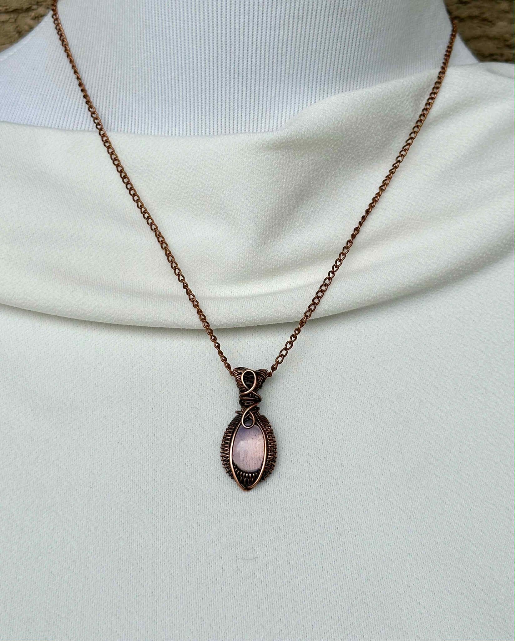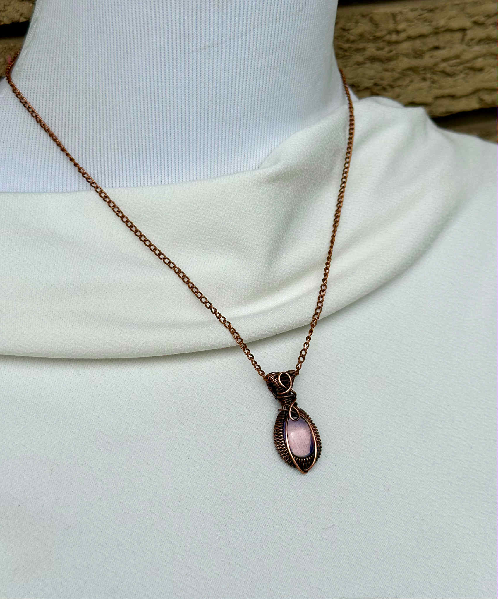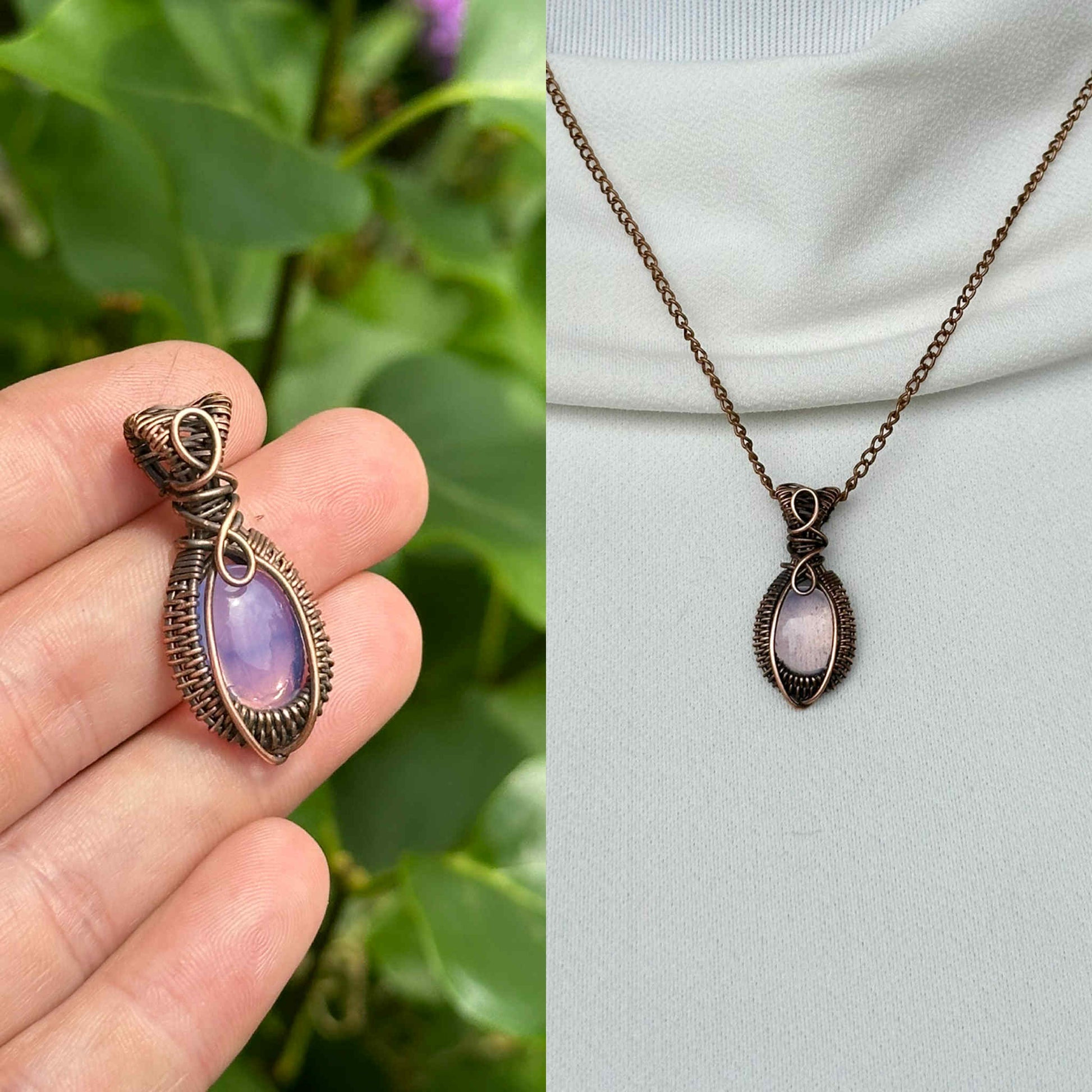 Wrapped in pure copper wire to harmonize the stone’s soothing energy with grounding warmth.