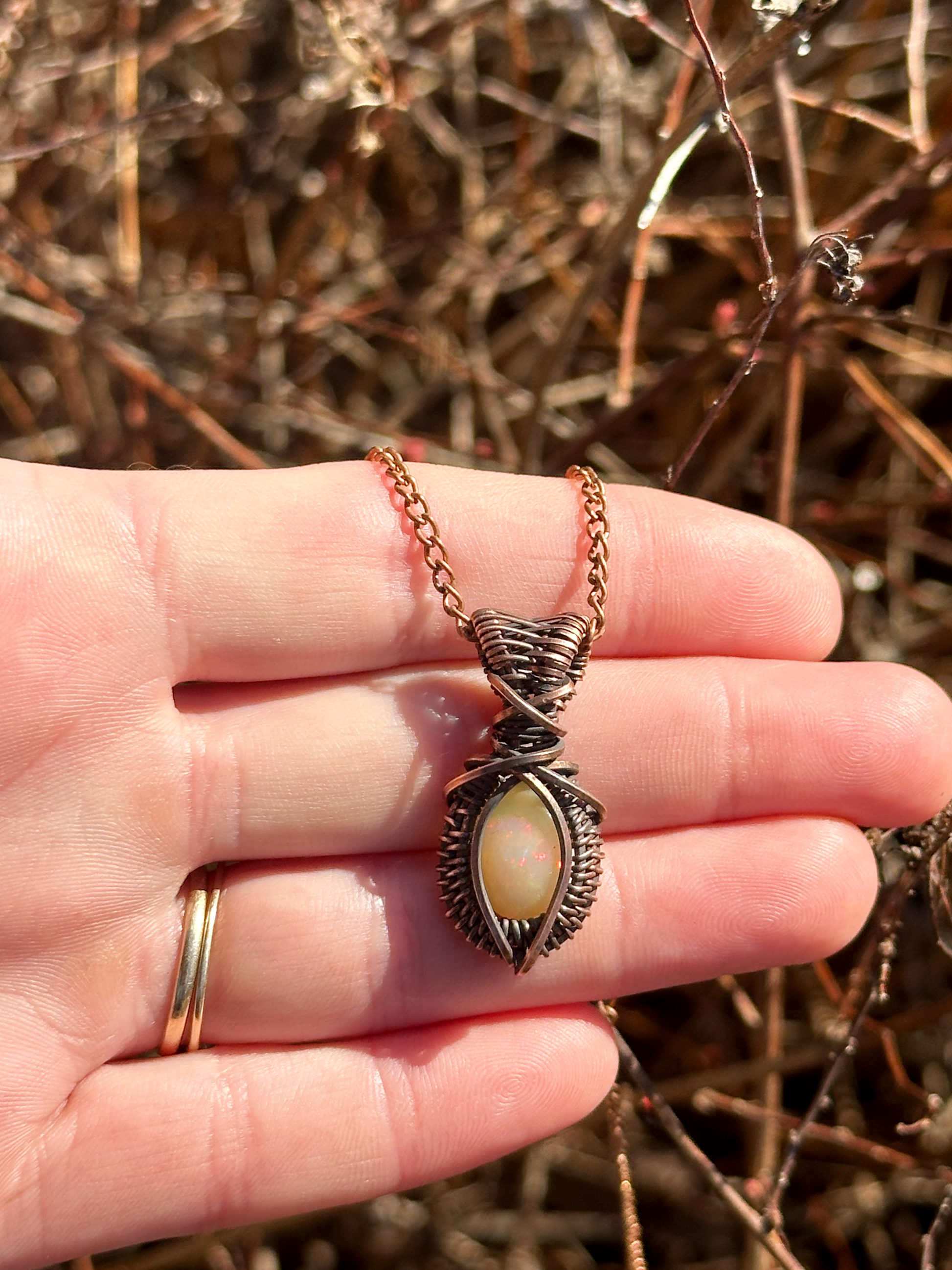 • Wrapped in 100% natural copper wire, this design amplifies opal’s dynamic energy. Copper enhances the stone’s properties, supporting emotional vitality and spiritual connection.