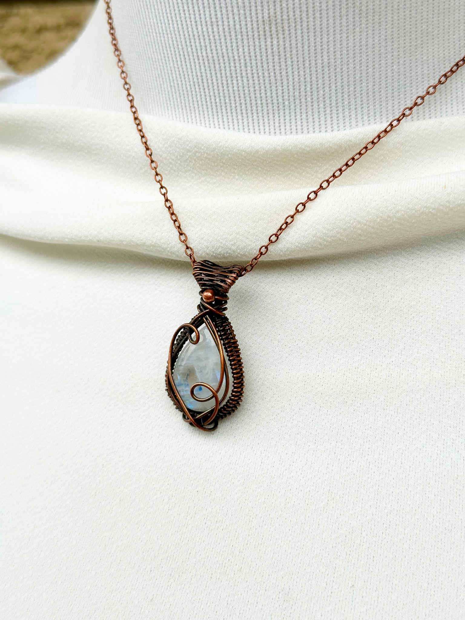 Suspended from a matching copper chain for strength, balance, and elegant movement.