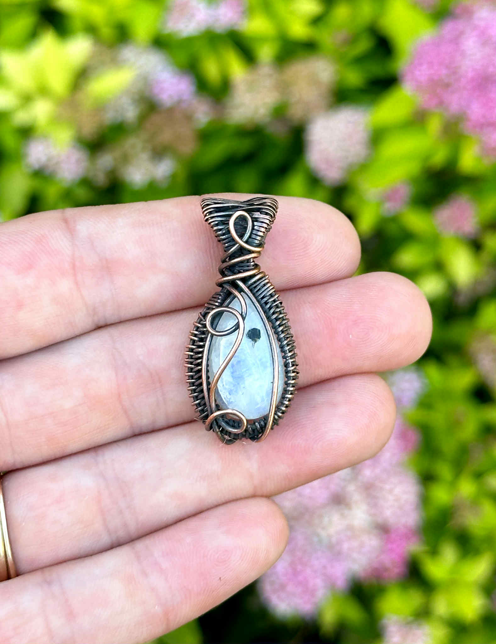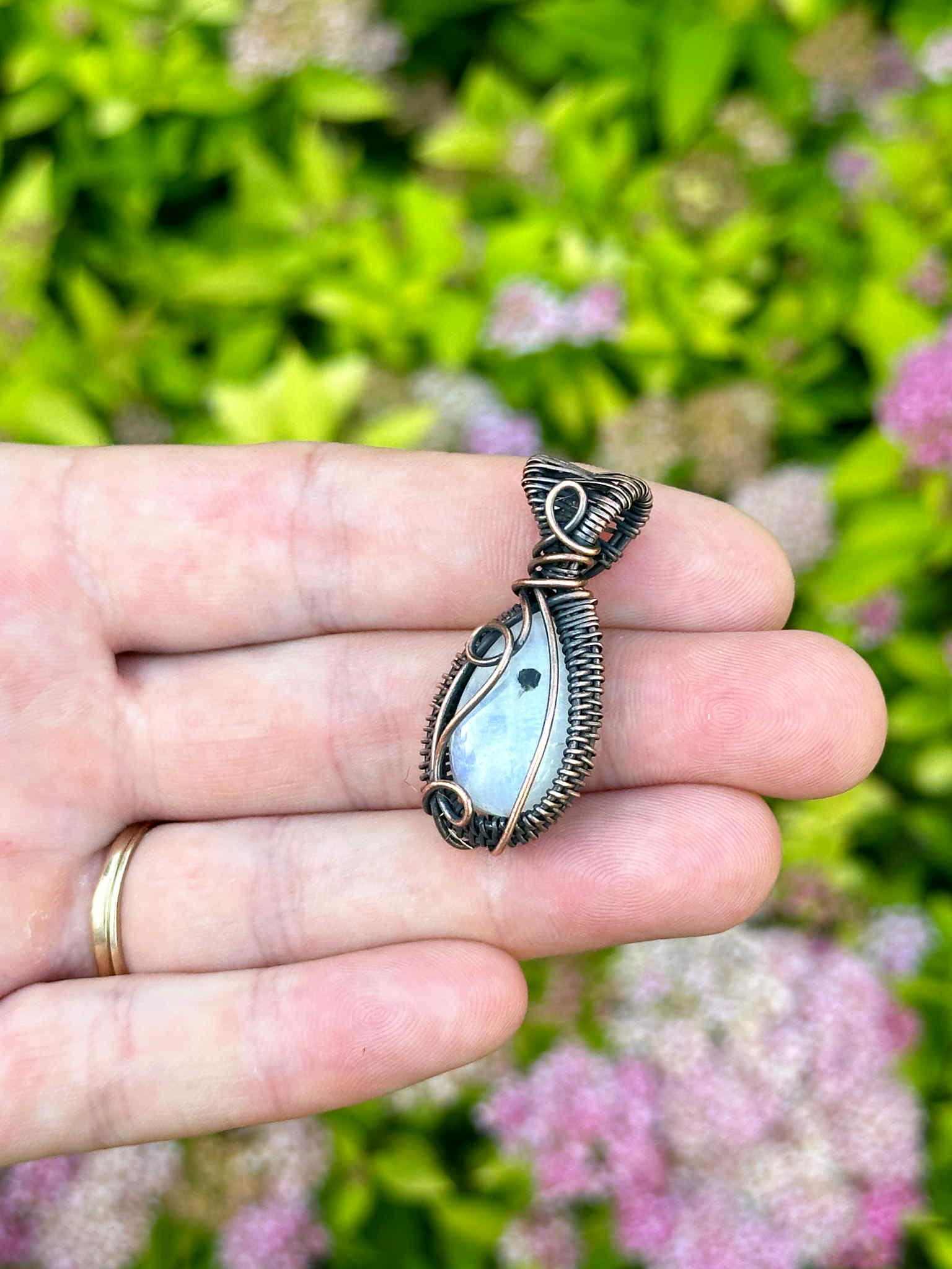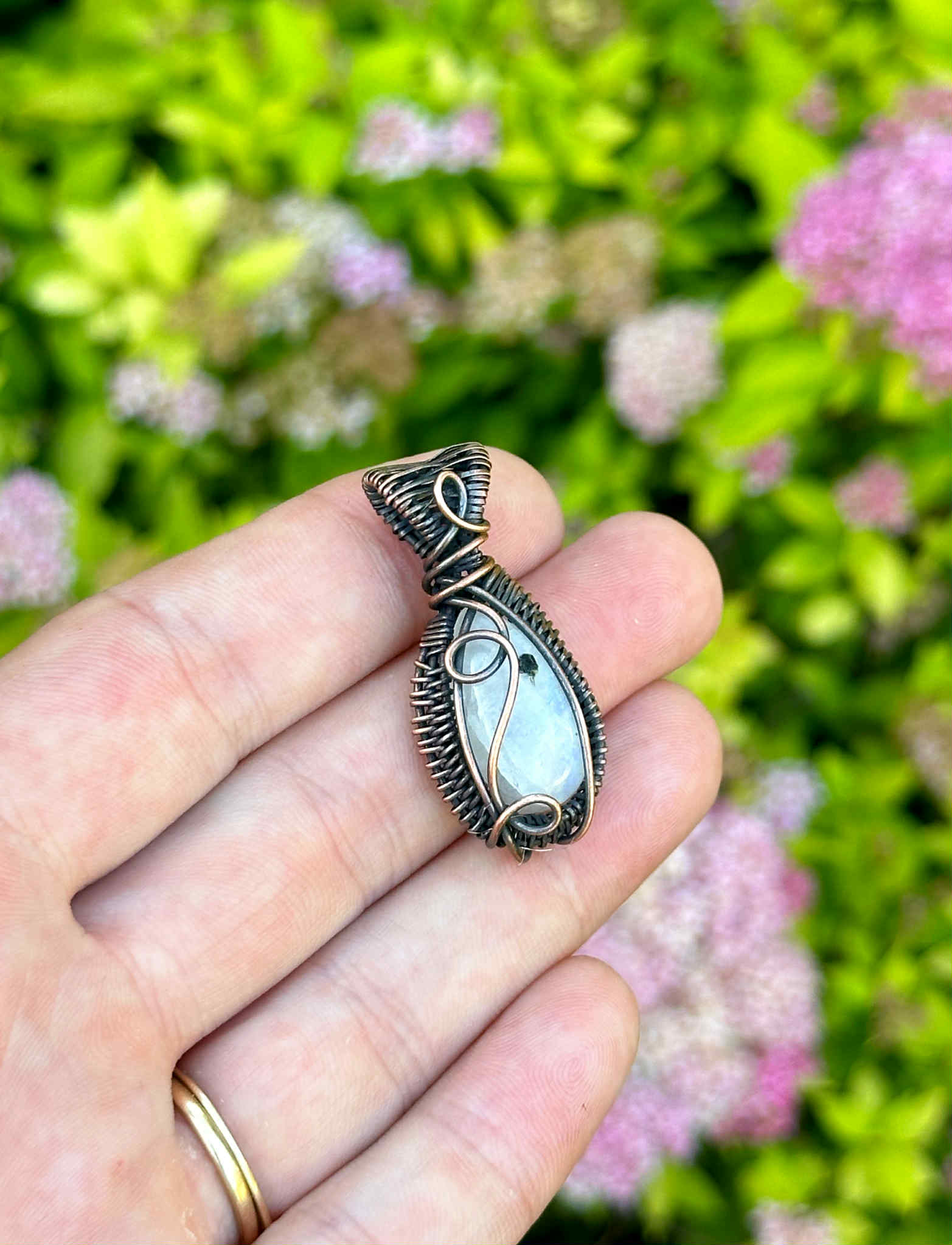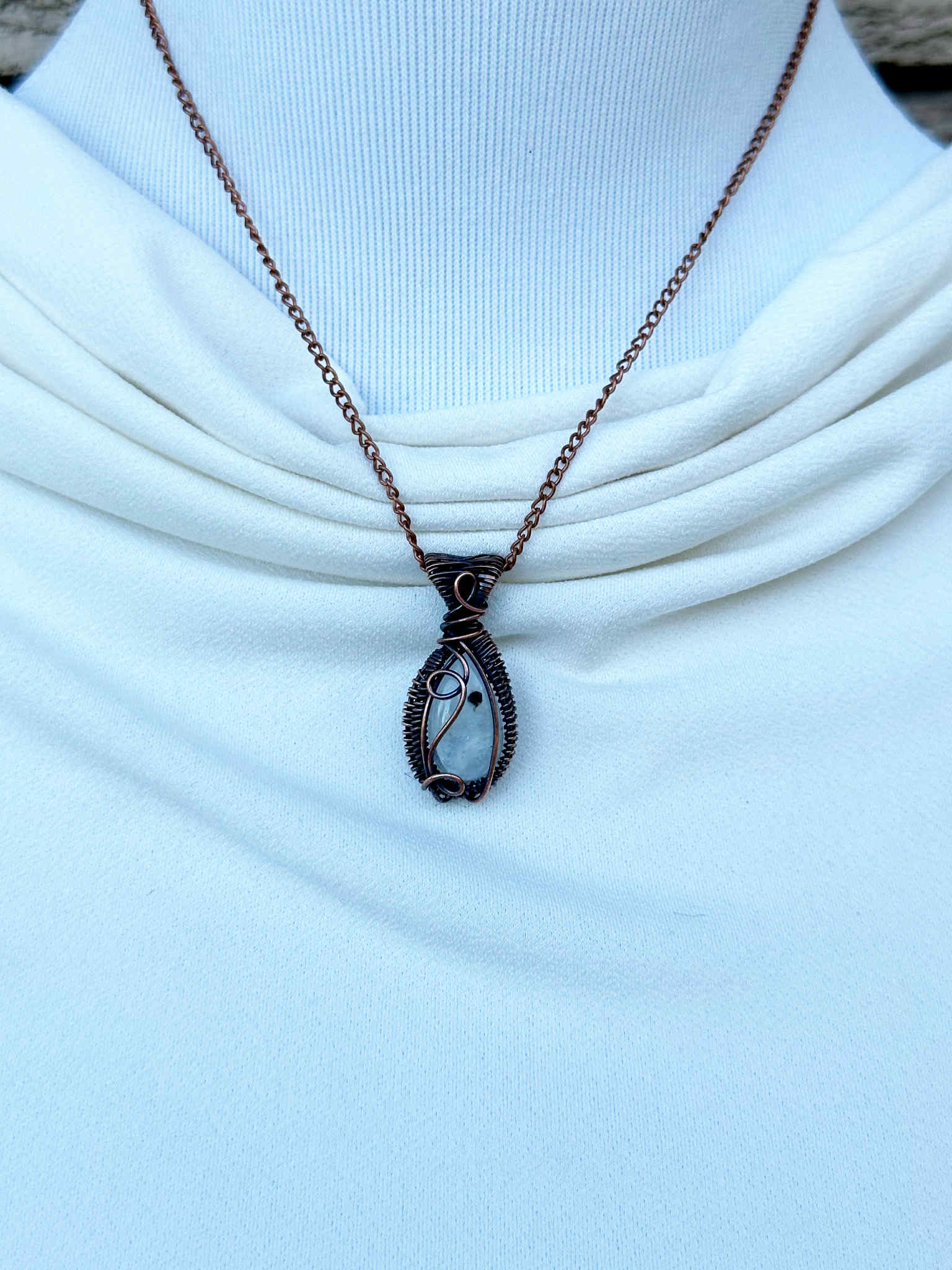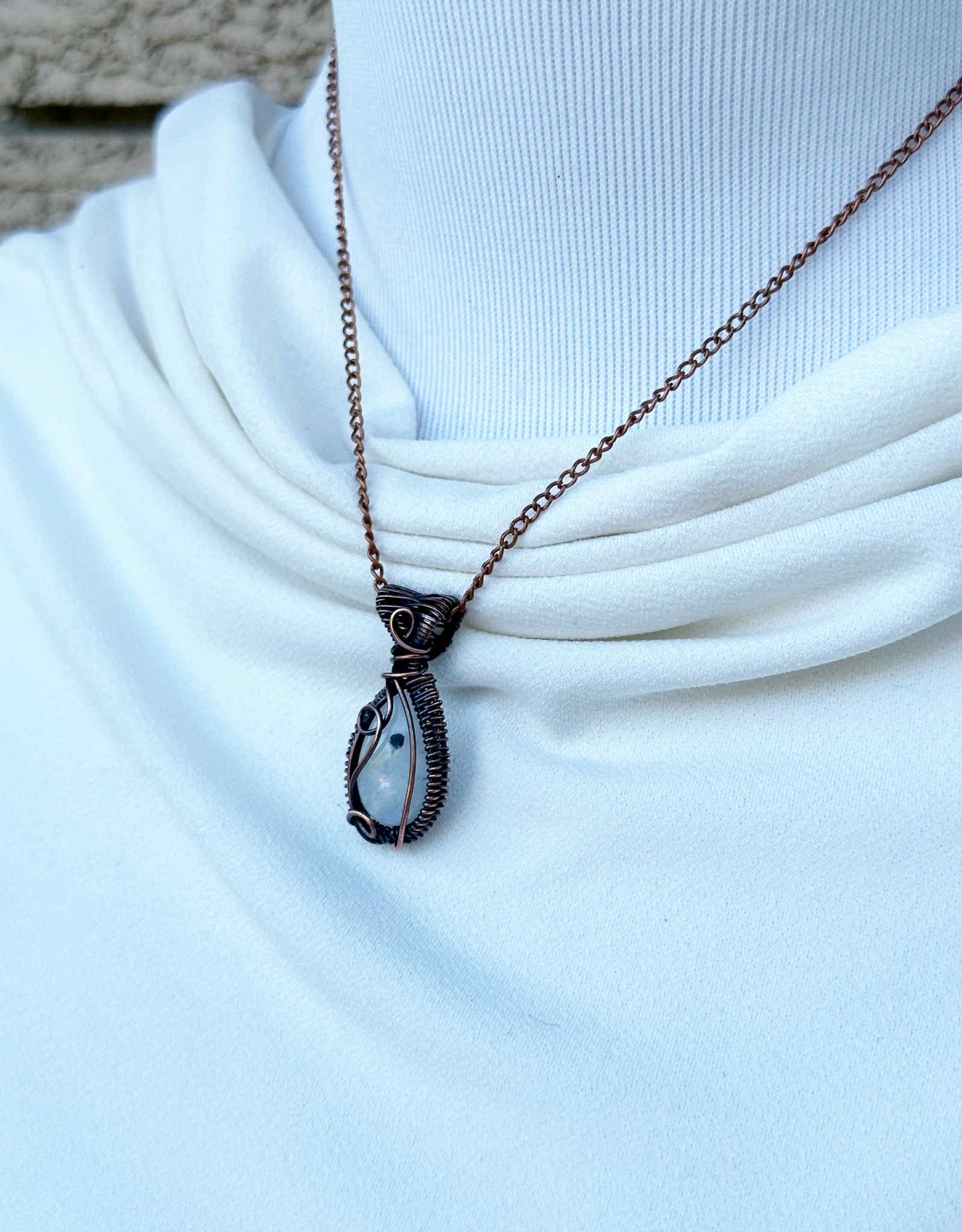 Wrapped in pure copper wire, which adds a grounding contrast to the stone’s soft, luminous tones.