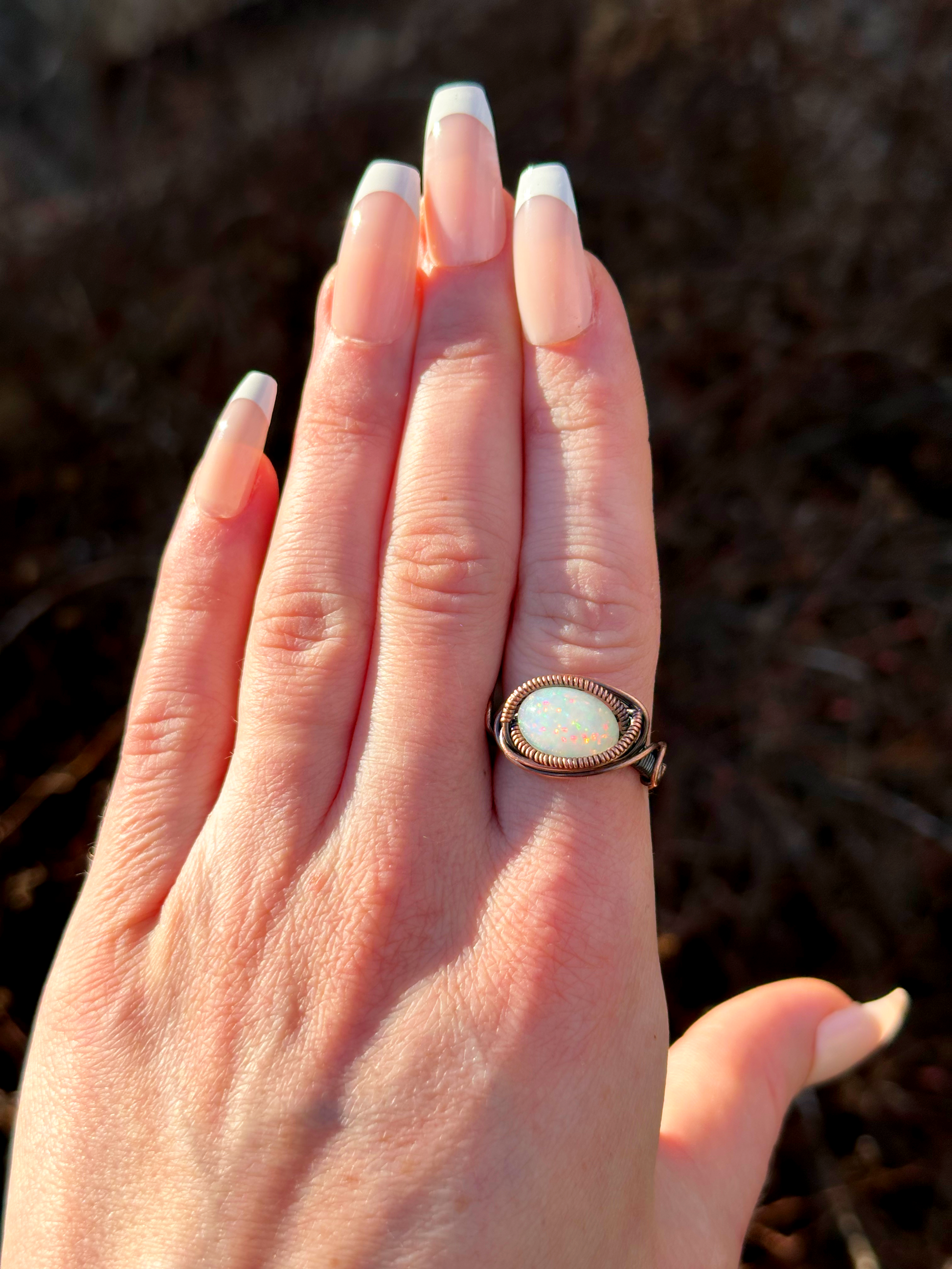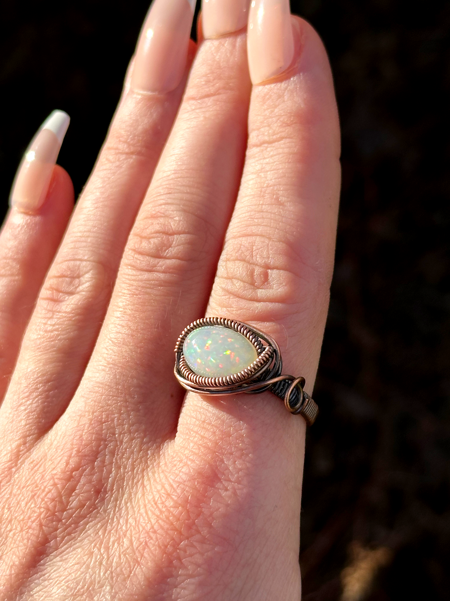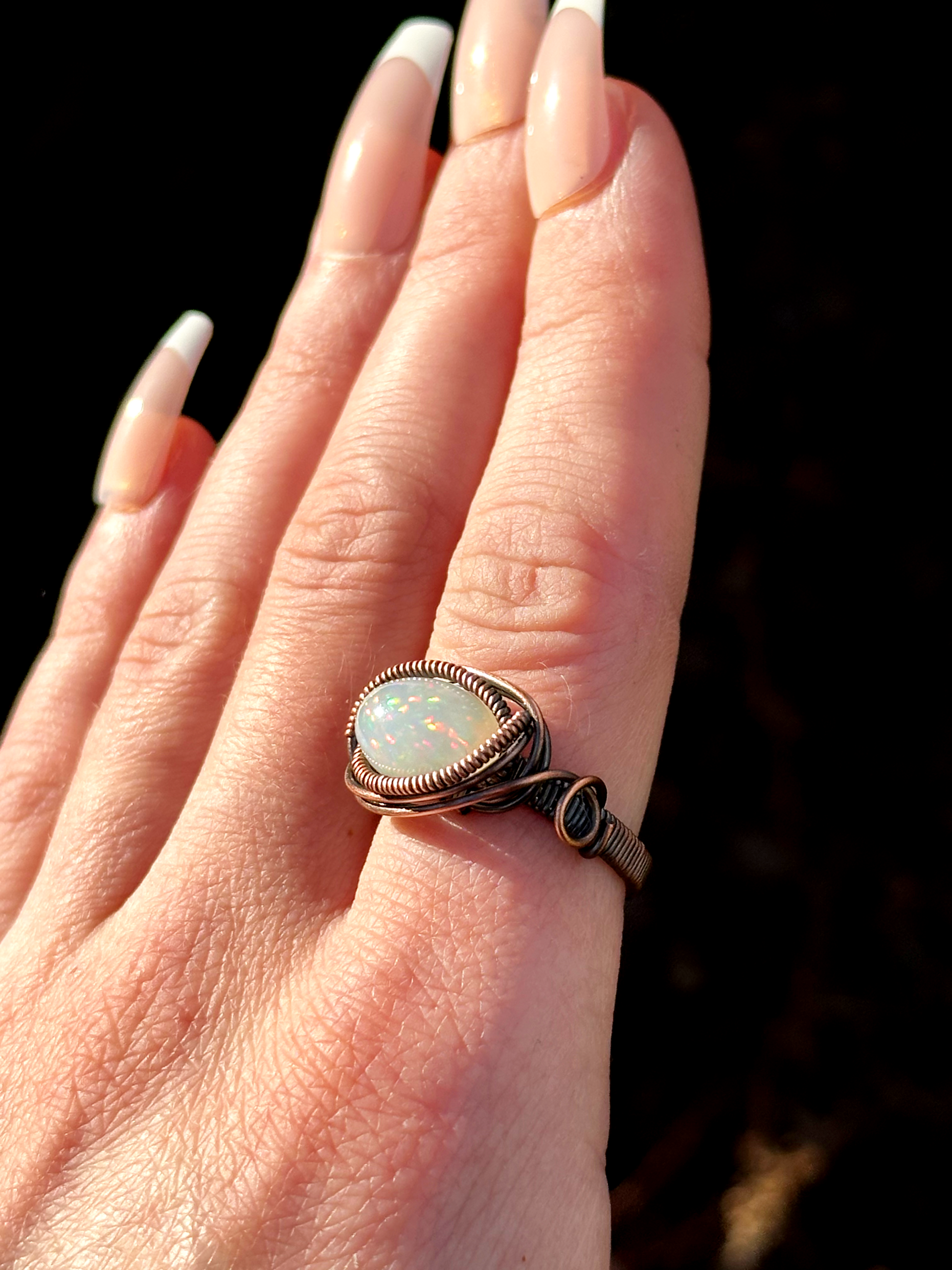 Introducing the Enchanting Opal Harmony Ring, a size 8 masterpiece crafted to captivate and inspire. This stunning ring features a luminous, ethically sourced opal, renowned for its mesmerizing play of color—shimmering with iridescent hues of azure, emerald, and fiery coral that dance in the light. The opal is expertly bezel-set in warm, hand-hammered copper, its rich, earthy tones accentuating the gemstone’s ethereal glow. The copper band, polished to a soft sheen, boasts a subtly textured finish, adding rustic charm and ensuring a comfortable fit for all-day wear. Each ring is meticulously handcrafted, making every piece uniquely yours—a perfect blend of bohemian elegance and timeless sophistication. Ideal for those who seek jewelry with soul, this Opal Harmony Ring is a statement of individuality, ready to elevate any outfit or occasion. Embrace the magic of opal and the enduring allure of copper in this unforgettable size 8 treasure.