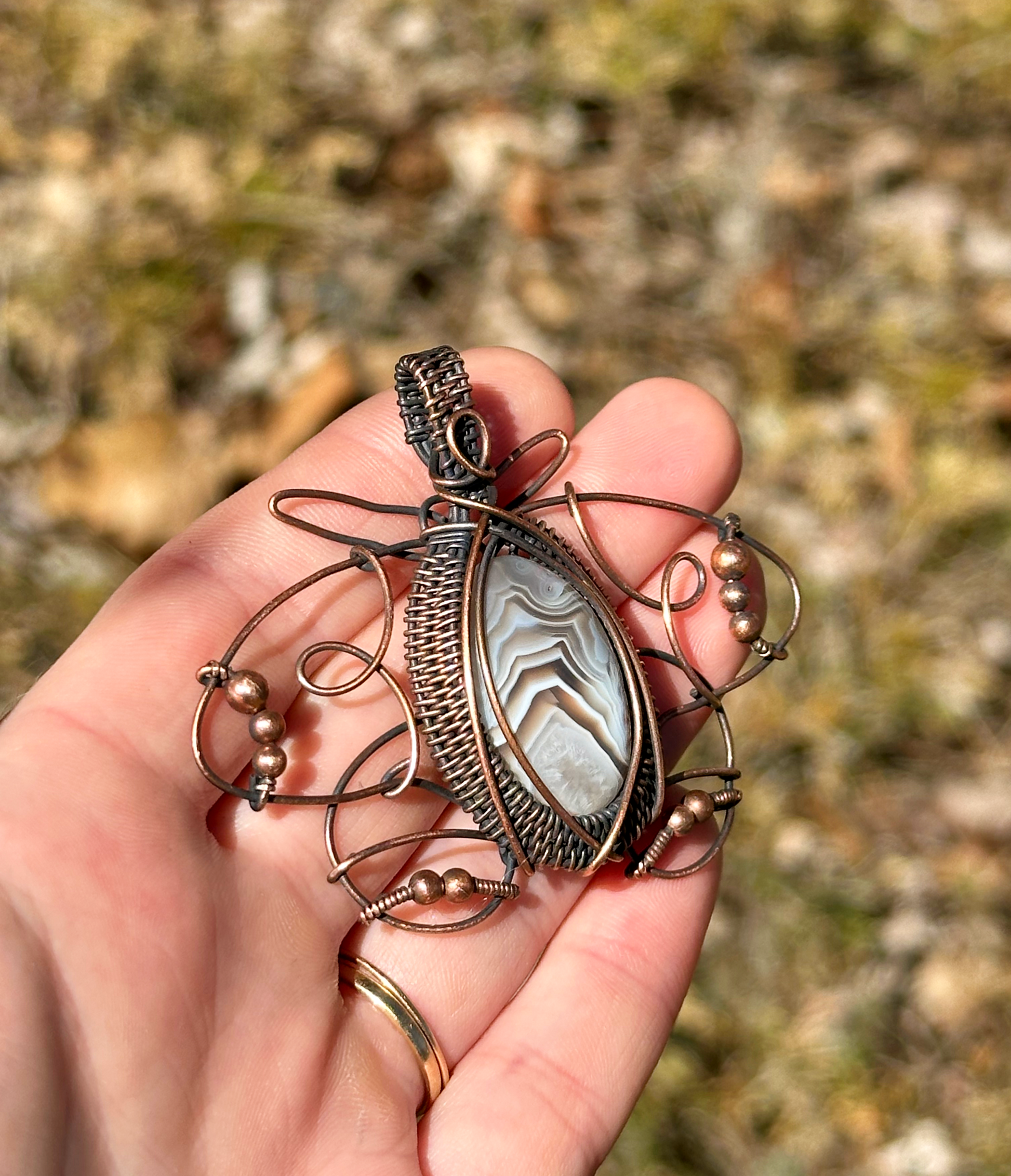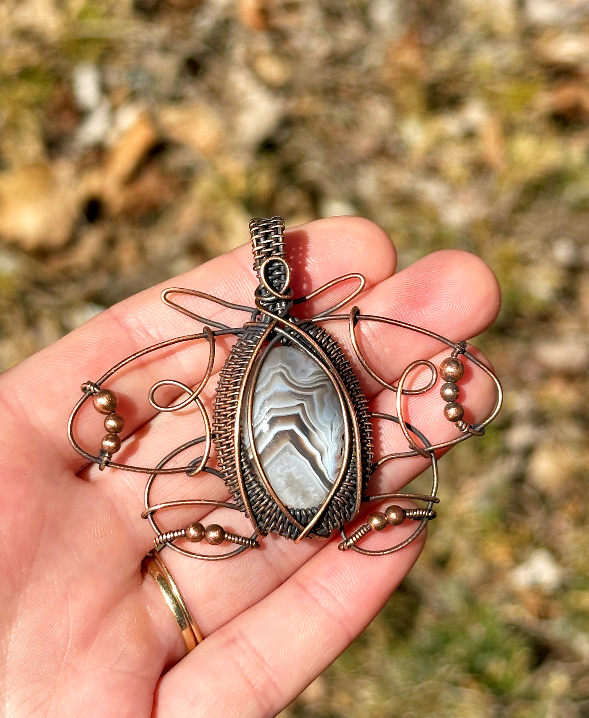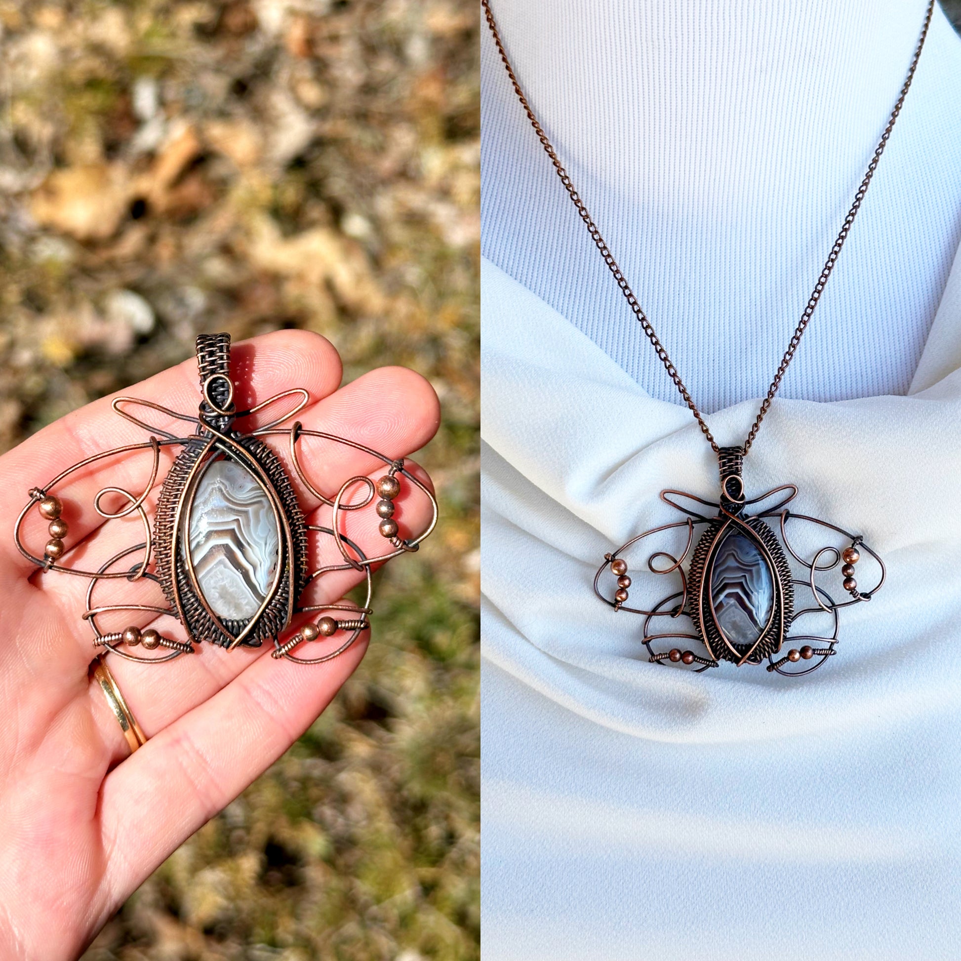 • Encased in 100% natural copper wire, this design amplifies the stone’s grounding energy. Copper enhances the agate’s properties, promoting emotional balance and physical vitality.