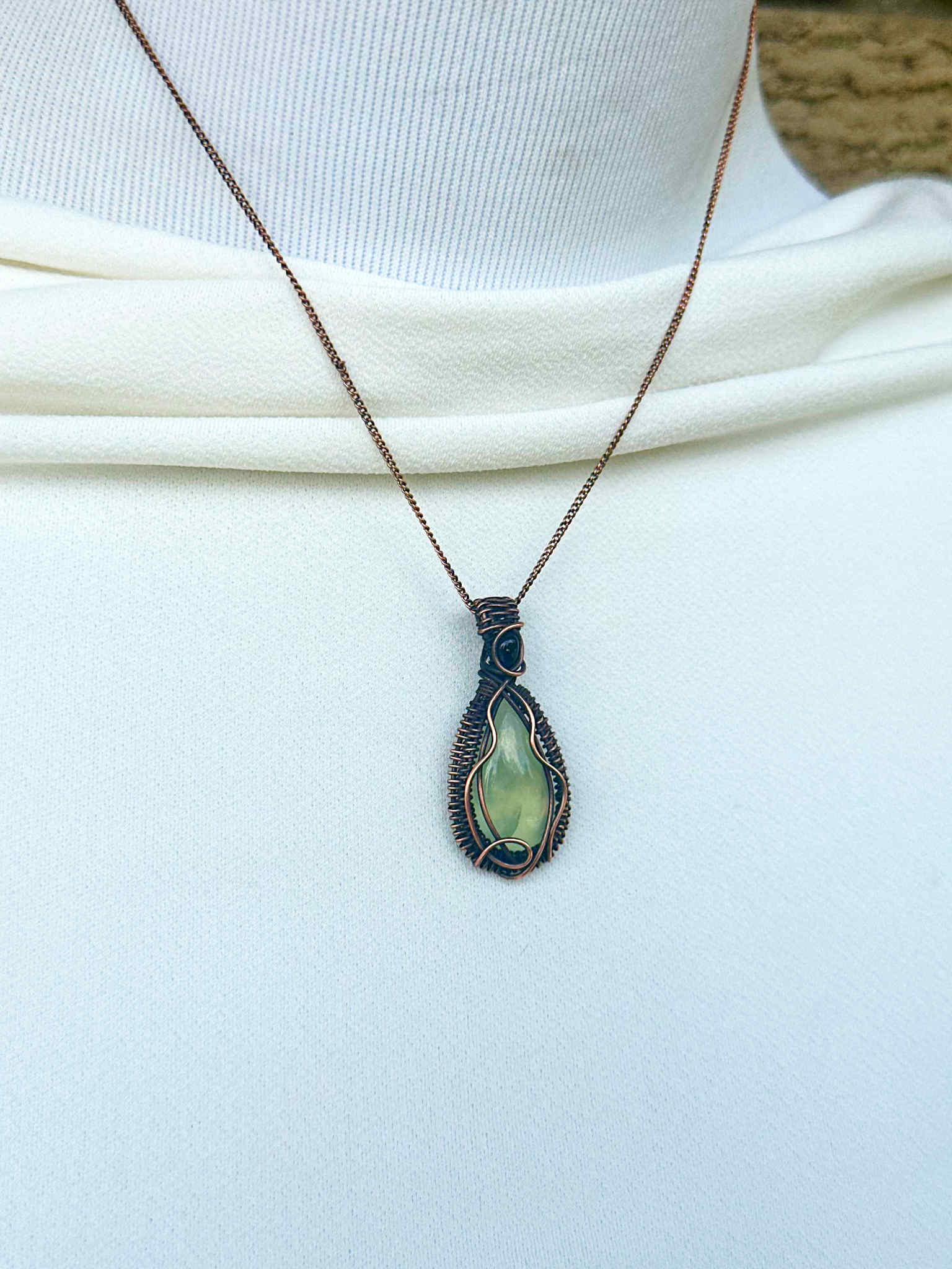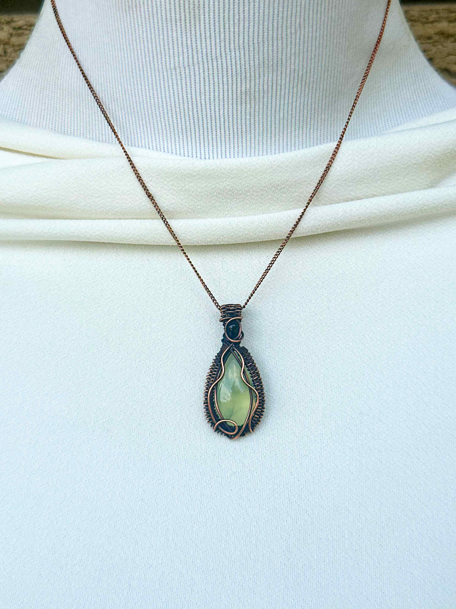 Wrapped in pure copper wire to harmonize the calming energy of Prehnite with the transformative power of Opal.