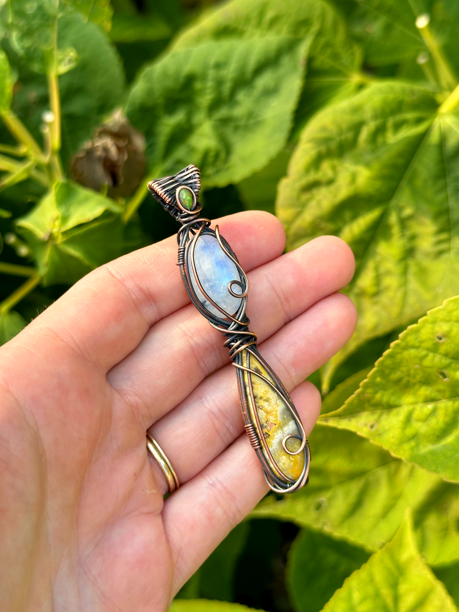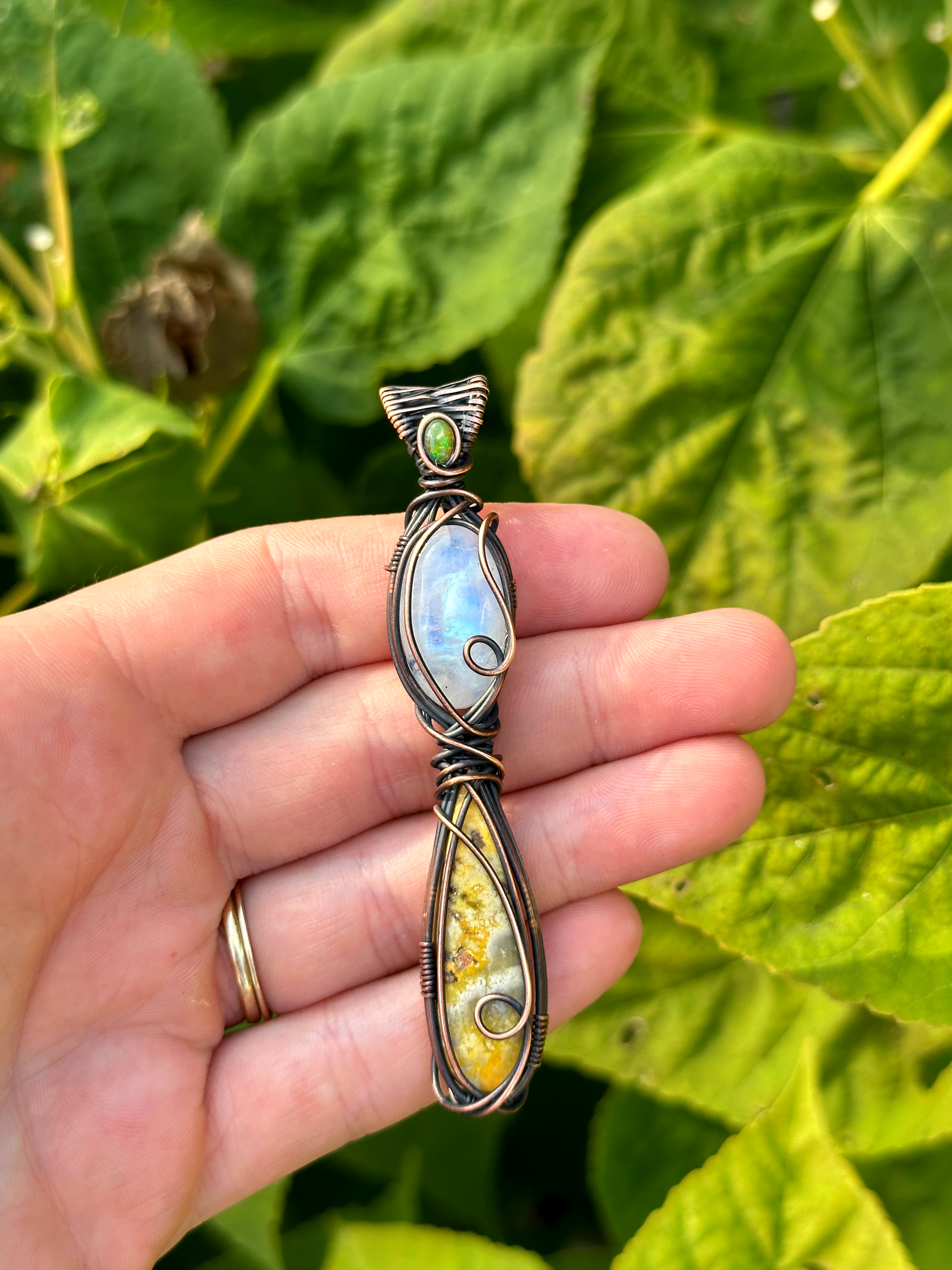 Triple Opal, Rainbow Moonstone, & Bumble Bee Jasper Crystal Copper Pendant