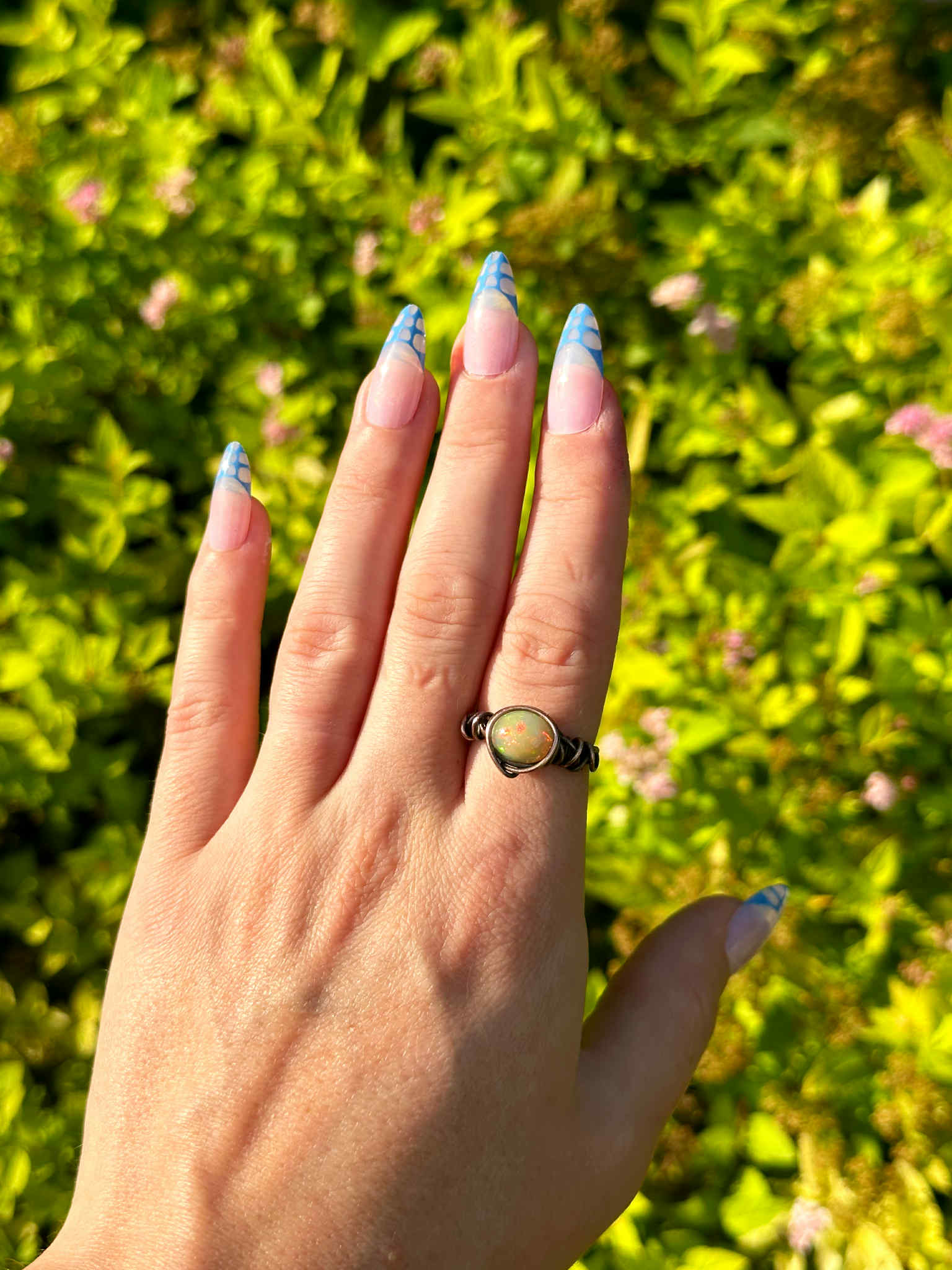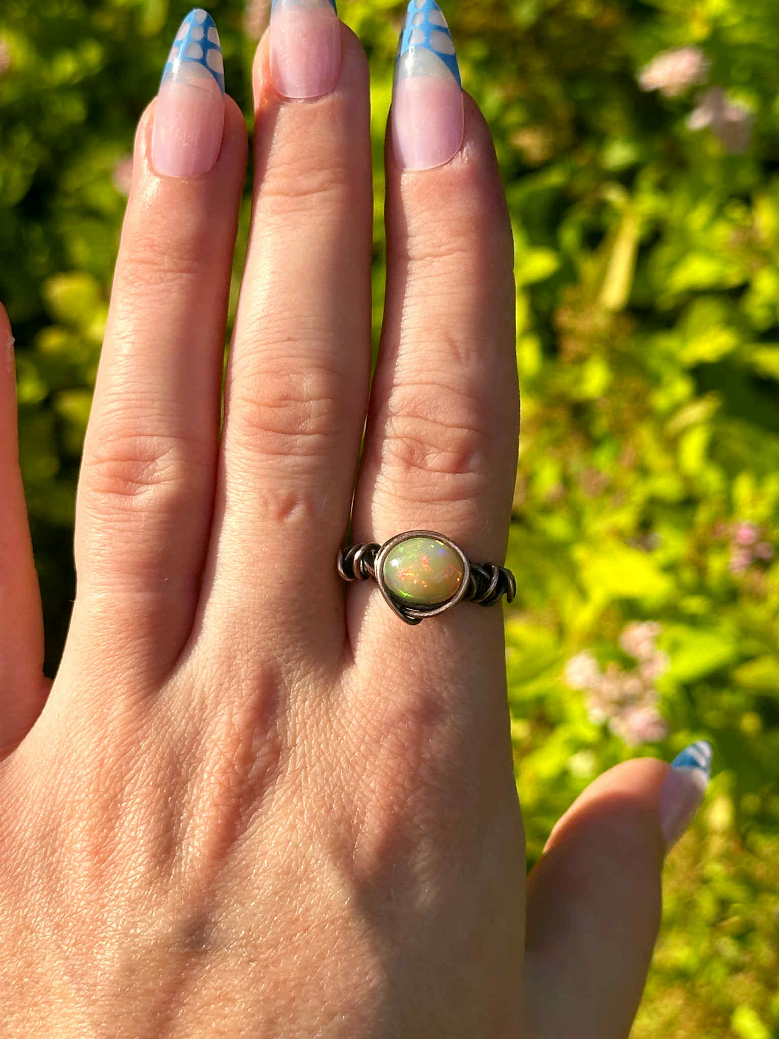 Introducing the Golden Aura Opal Ring, a size 7 treasure crafted to radiate warmth and wonder. Centered by a single, ethically sourced opal, this luminous gemstone shimmers with a spectrum of soft honey gold, pale amber, and fleeting hints of pink and green that flicker like sunlight through crystal. Its glowing hues are bezel-set in hand-forged copper, the earthy richness of the metal amplifying the opal’s radiant light.