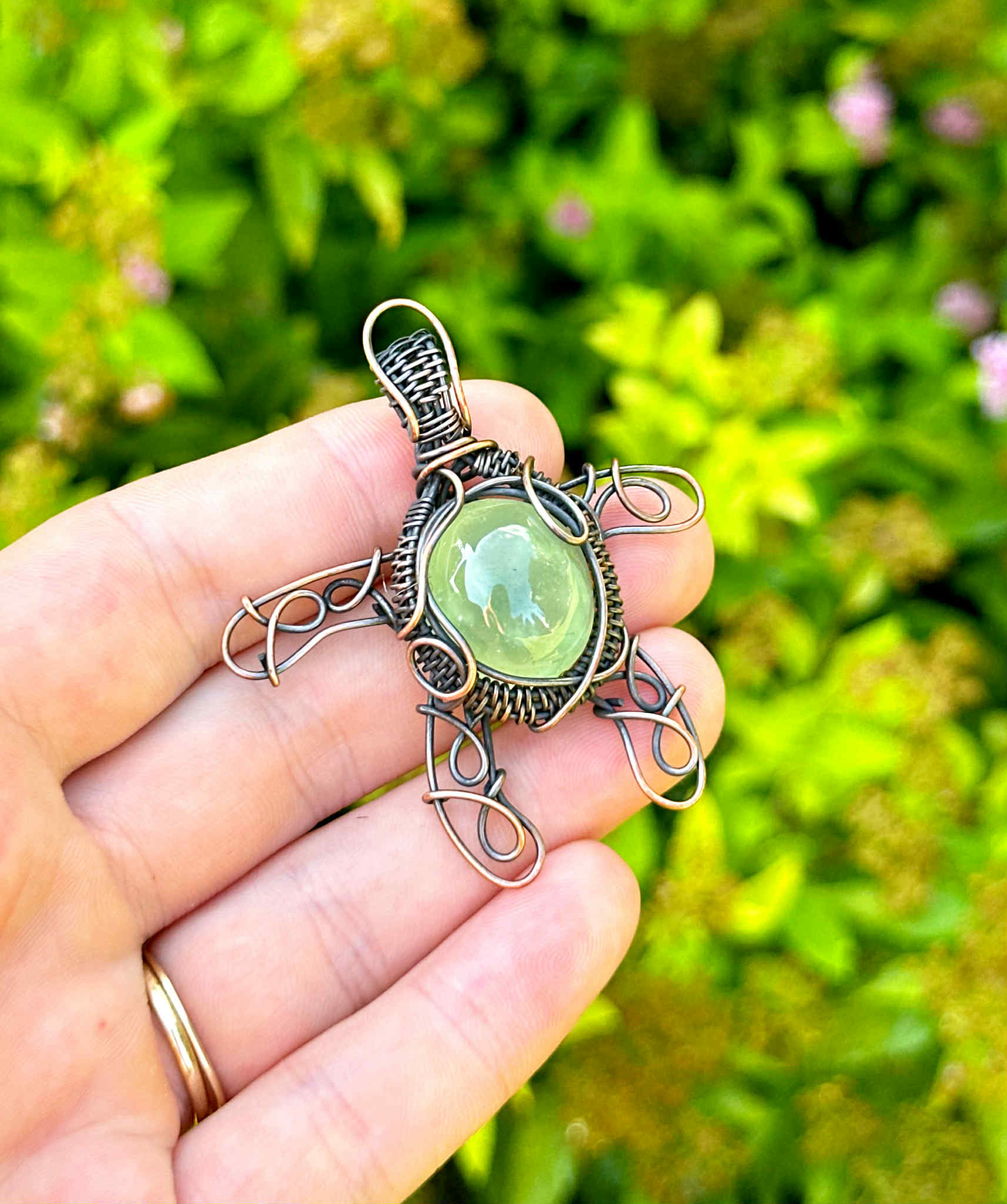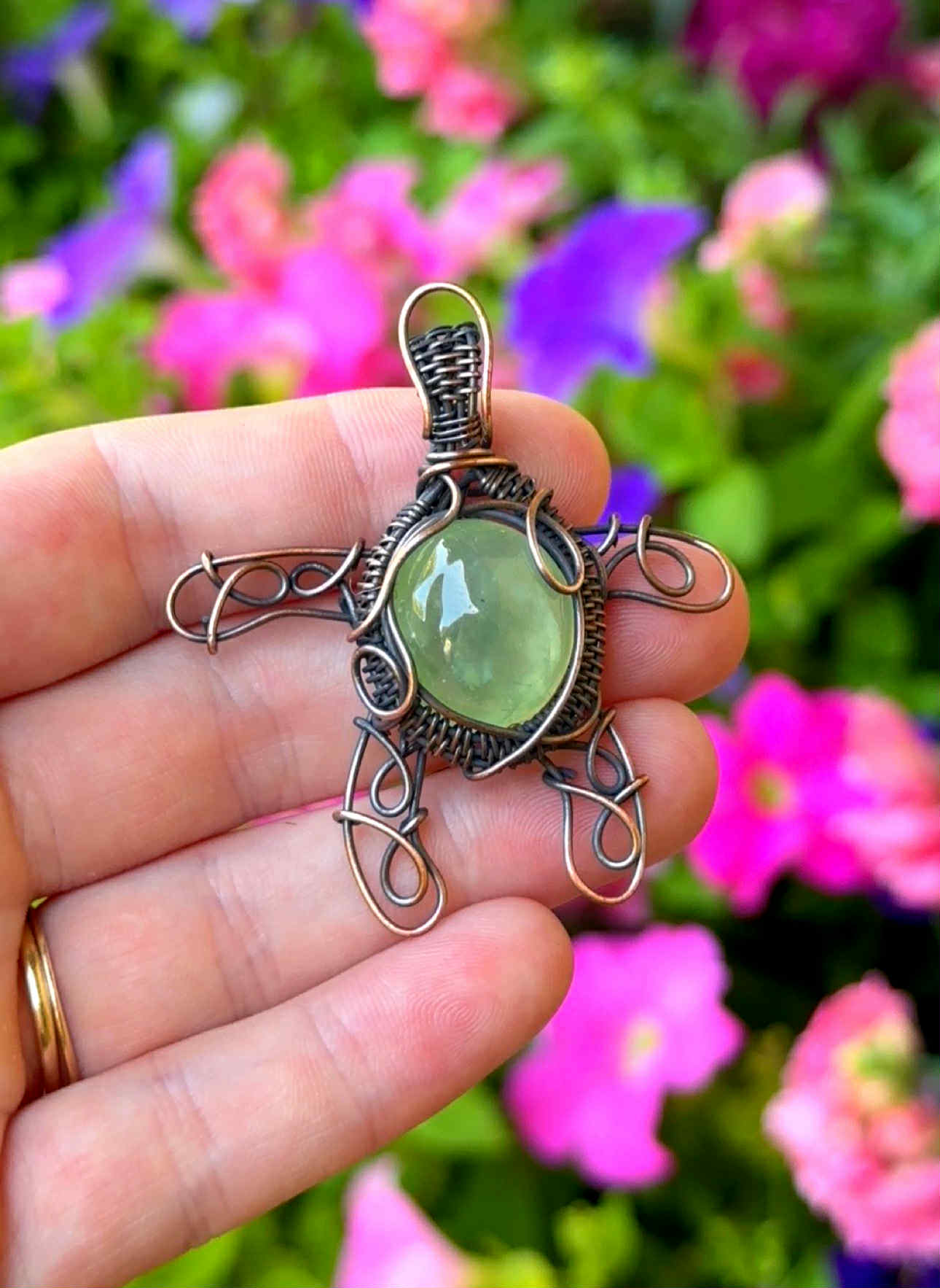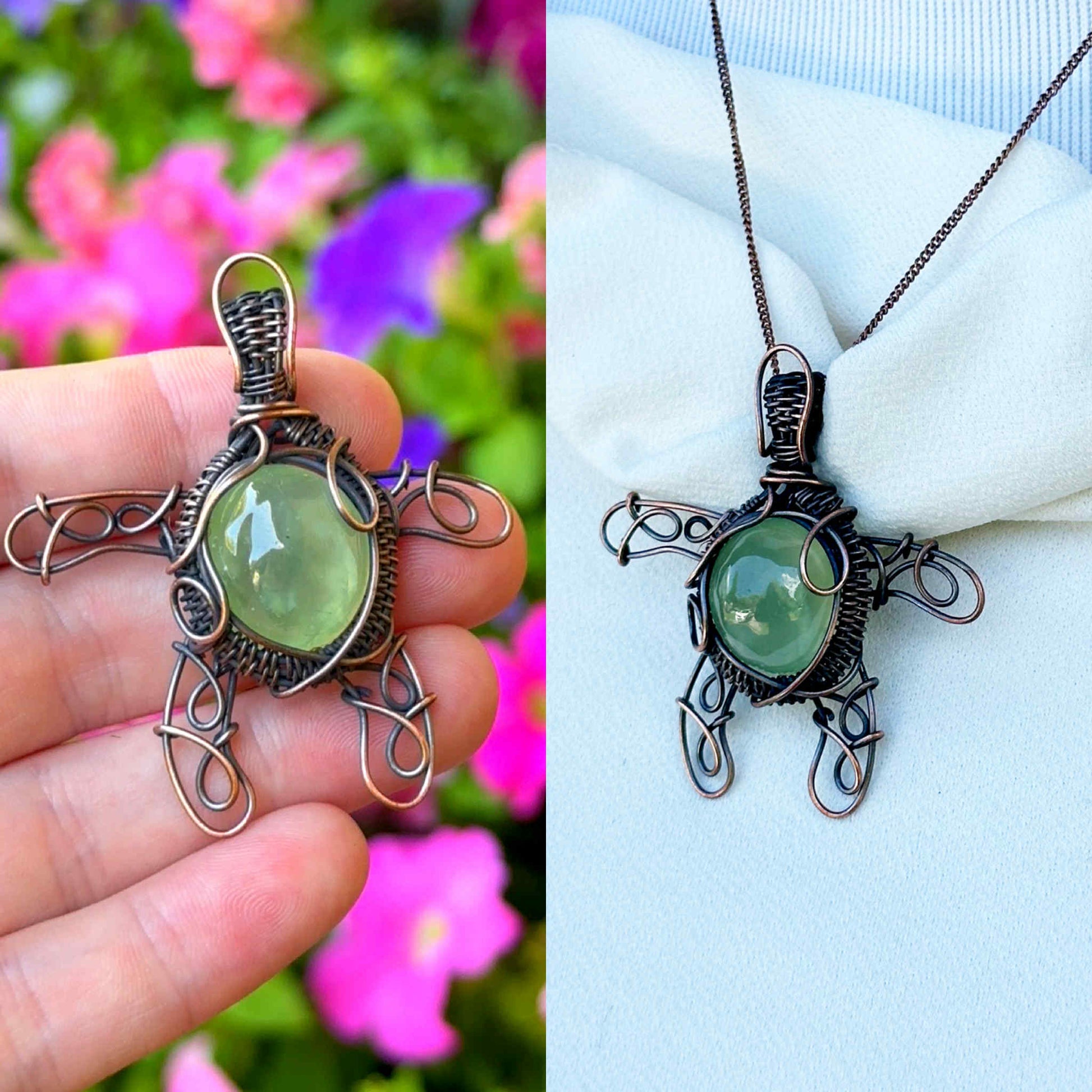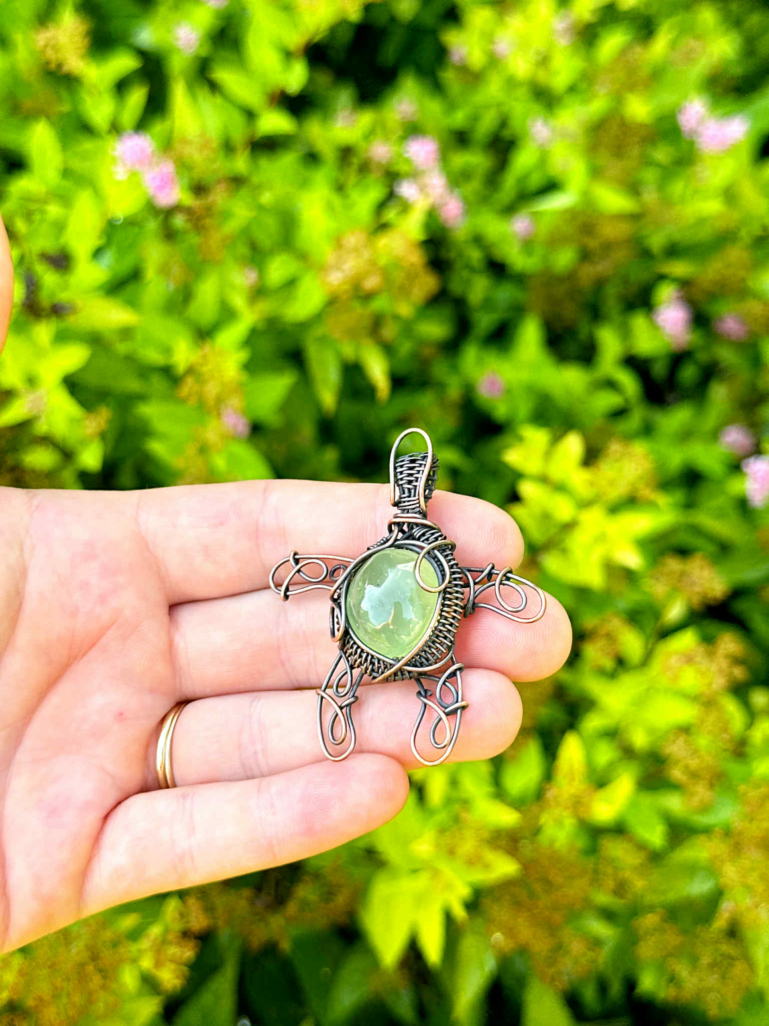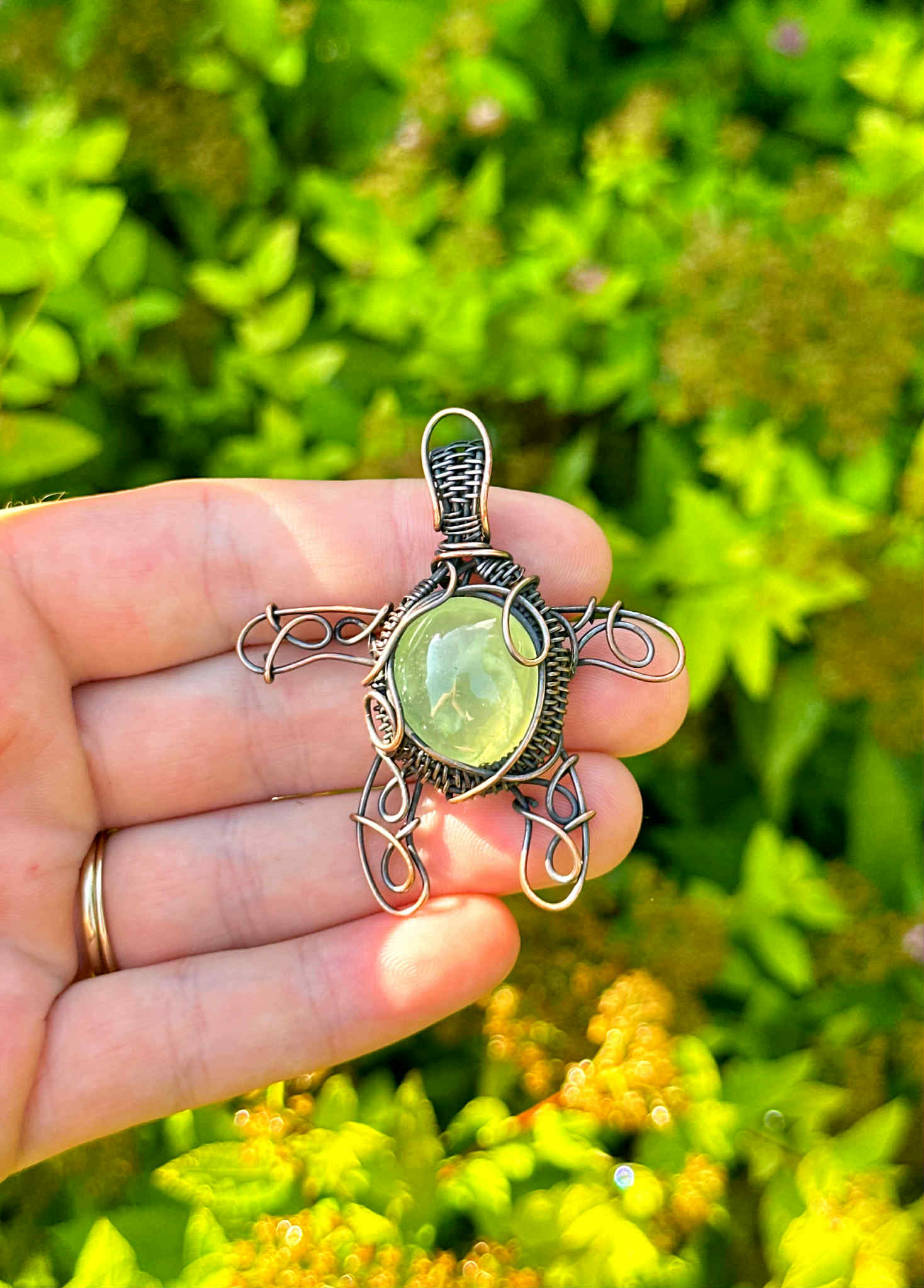 Calm, nurturing, and deeply grounding, this Prehnite pendant is a symbol of protection and peaceful endurance. Paired with a handcrafted turtle symbol, it becomes a talisman for healing, longevity, and steady progress on your personal journey.