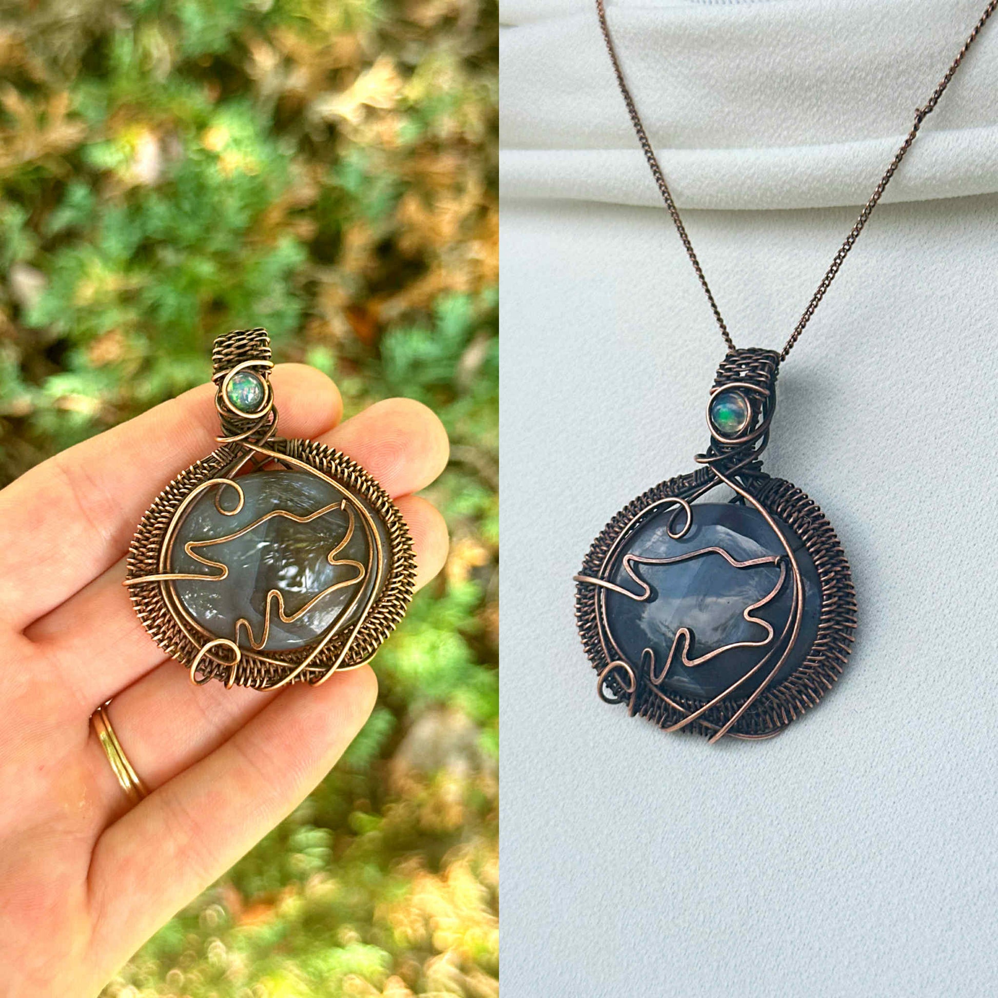 Wolf Grey Agate & Opal Crystal Copper Pendant