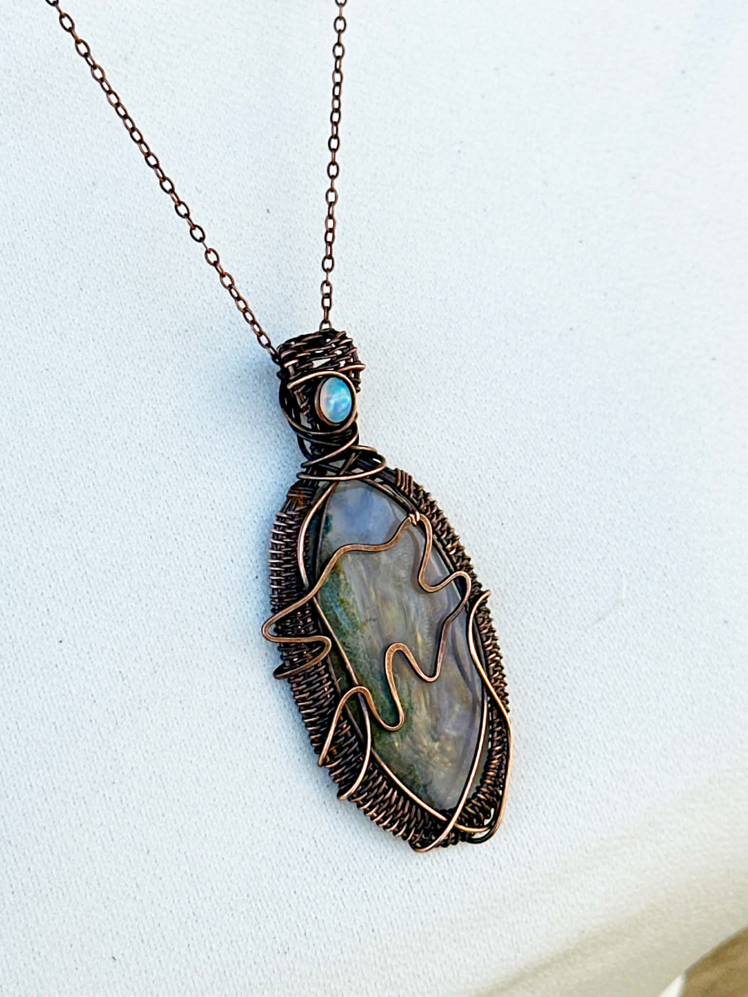 Wolf Moss Agate & Opal Crystal Copper Pendant